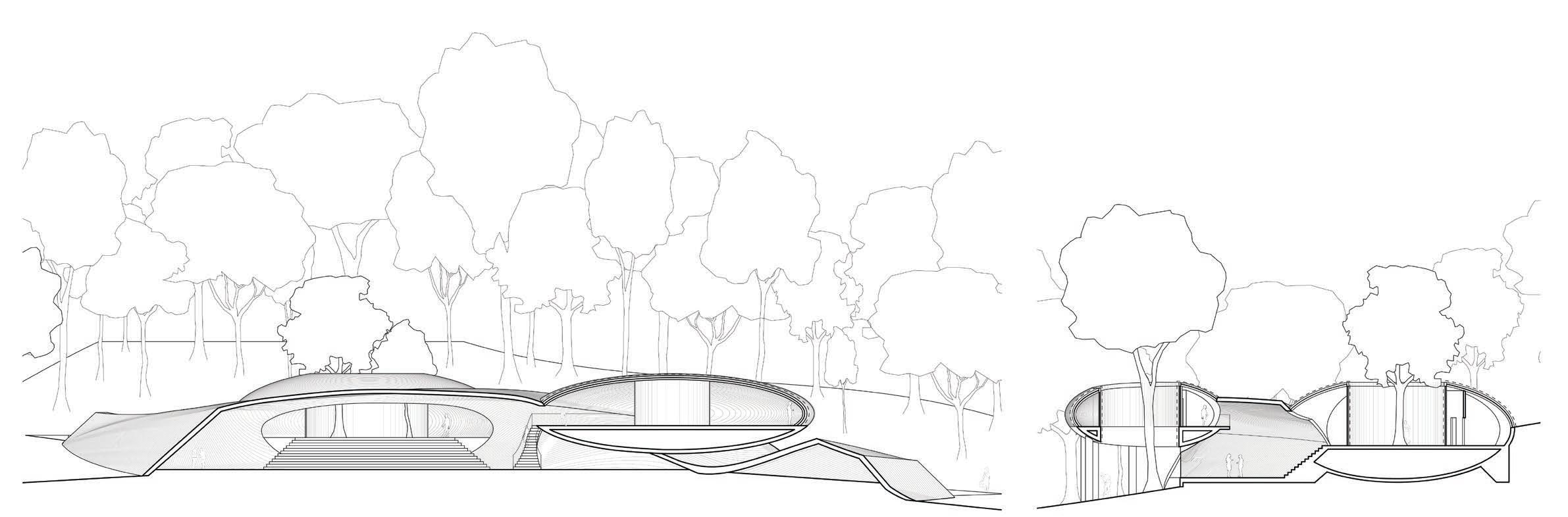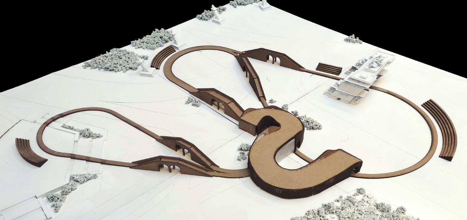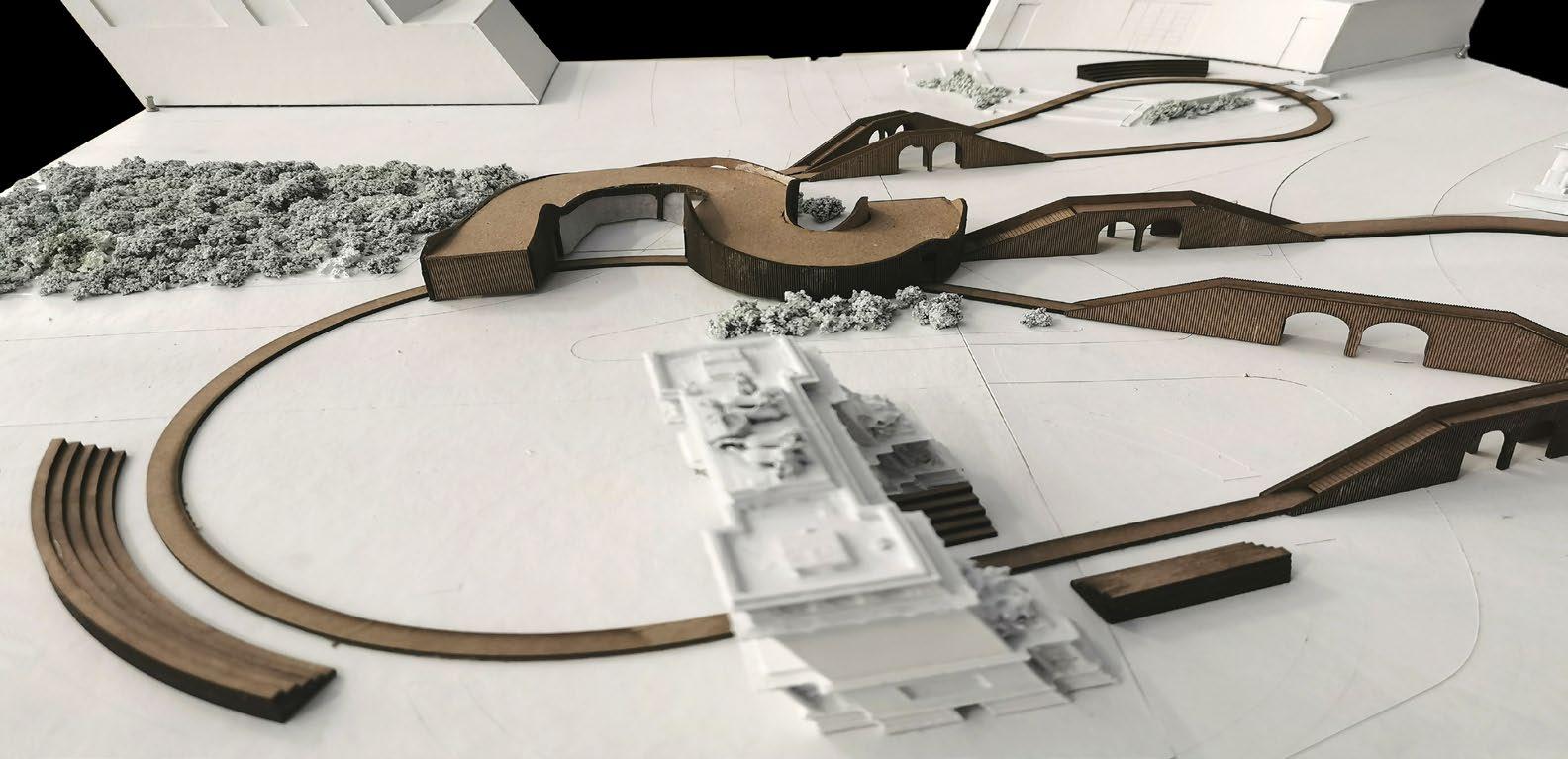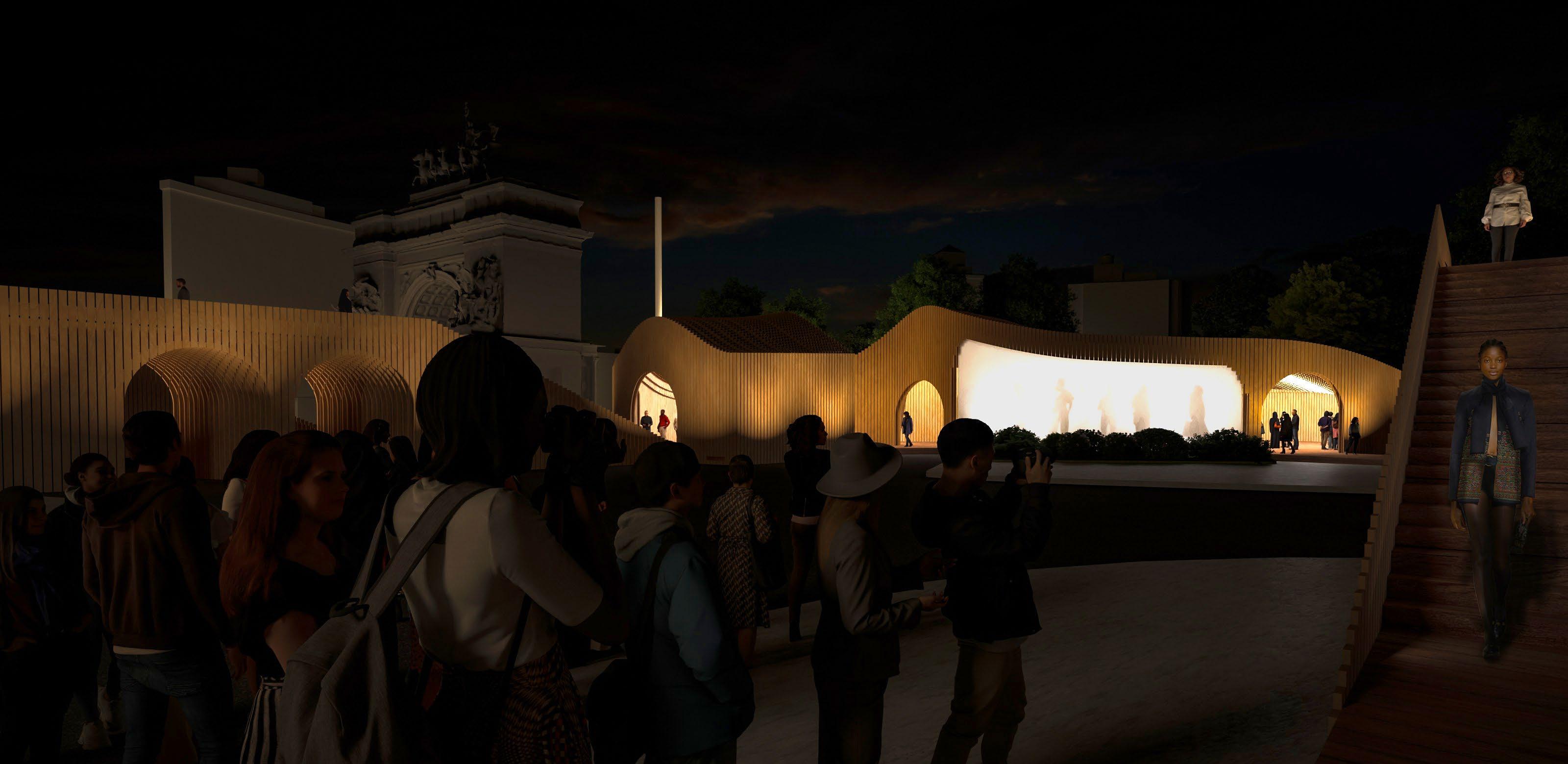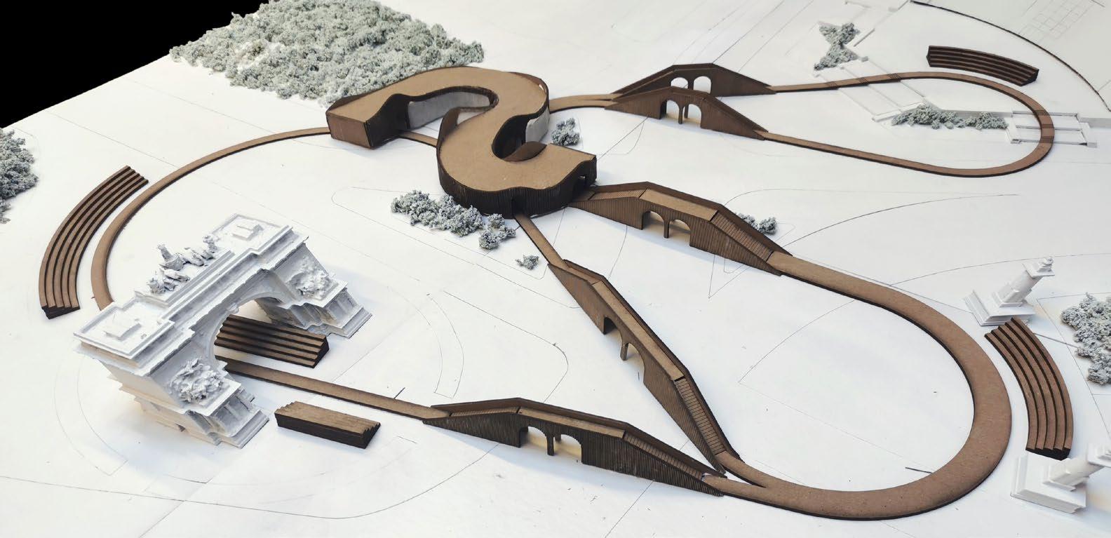 Bode is a fashion label focused on using classic elements of fashion design in new and exiting ways. For this design project, the aim was to create a hypothetical public runway exhibition for this designer based on their design styles and motifs. Set in Grand Army Plaza in Brooklyn, this temporary structure exists to allow many overlapping views of the runway and the famous landmarks in the area. The core inspiration for the runway design came from the arrangements of views to frame the runway and models at multiple distances and highlight the existing city in the far distance. Working with Bode’s strong historical influence in mind, drawing on these existing site elements was the natural course to take. Further, as Brooklyn is a historical center of transit, bridges are used to allow car traffic through in limited amounts, bringing a new way to view the show from the rich American tradition of drive through attractions.