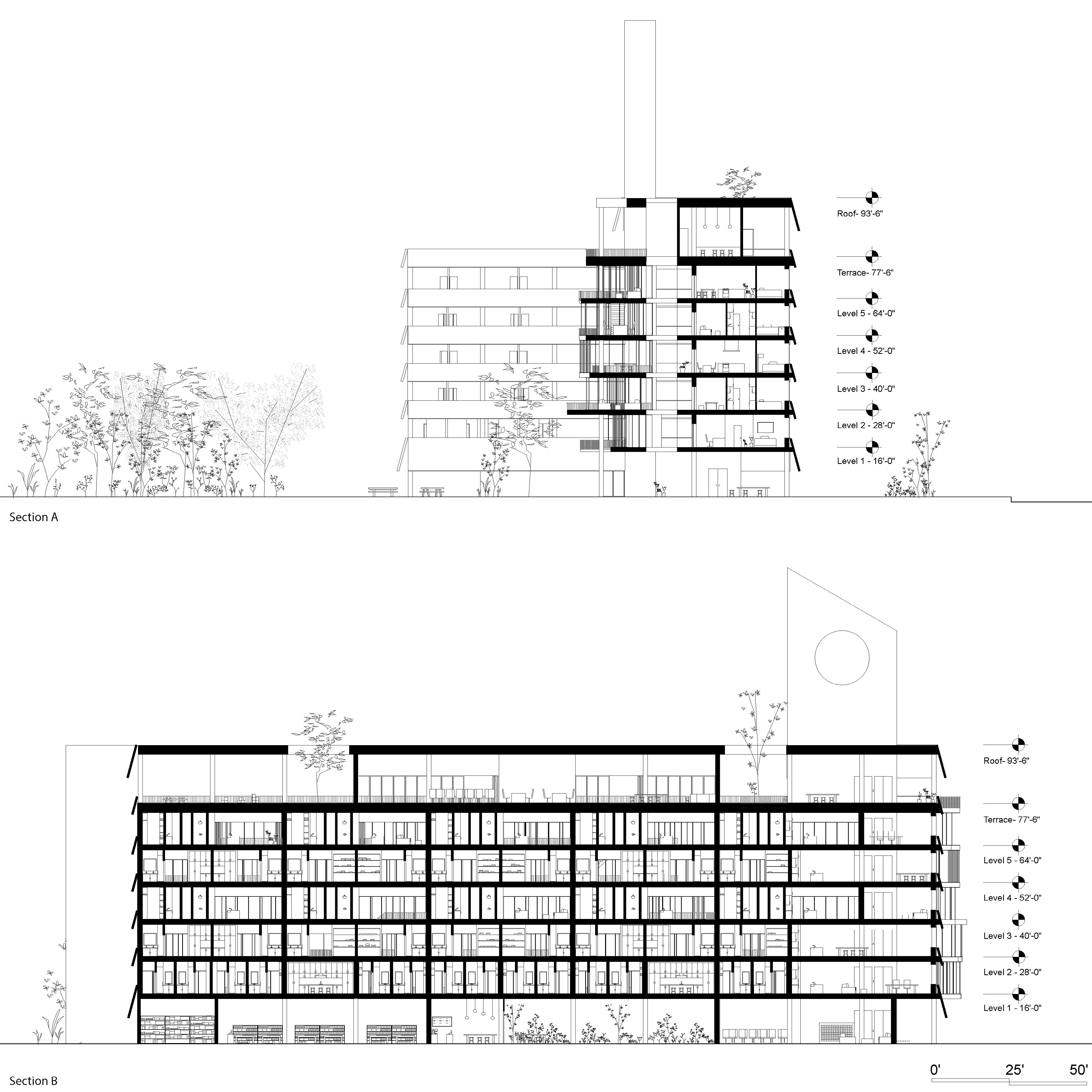 With the I-81 viaduct scheduled to come down in the near future, the entire class of 307 is tasked with designing housing to occupy the soon to be empty sites along the highway’s path. This project is a co-living project designed for an imagined collective of diverse age and background. The building aims to provide flexibility and comfort to individuals and groups by providing many shared amenities and opportunities to choose one’s own level of privacy. The individual units dissolve the living space into private areas along the street-facing facade, a strip of service spaces, and an operable living area in each unit that can be completely opened up to a larger band of shared space in each floor. This allows residents to choose how they interact with their peers and gives them flexibility day over day.
