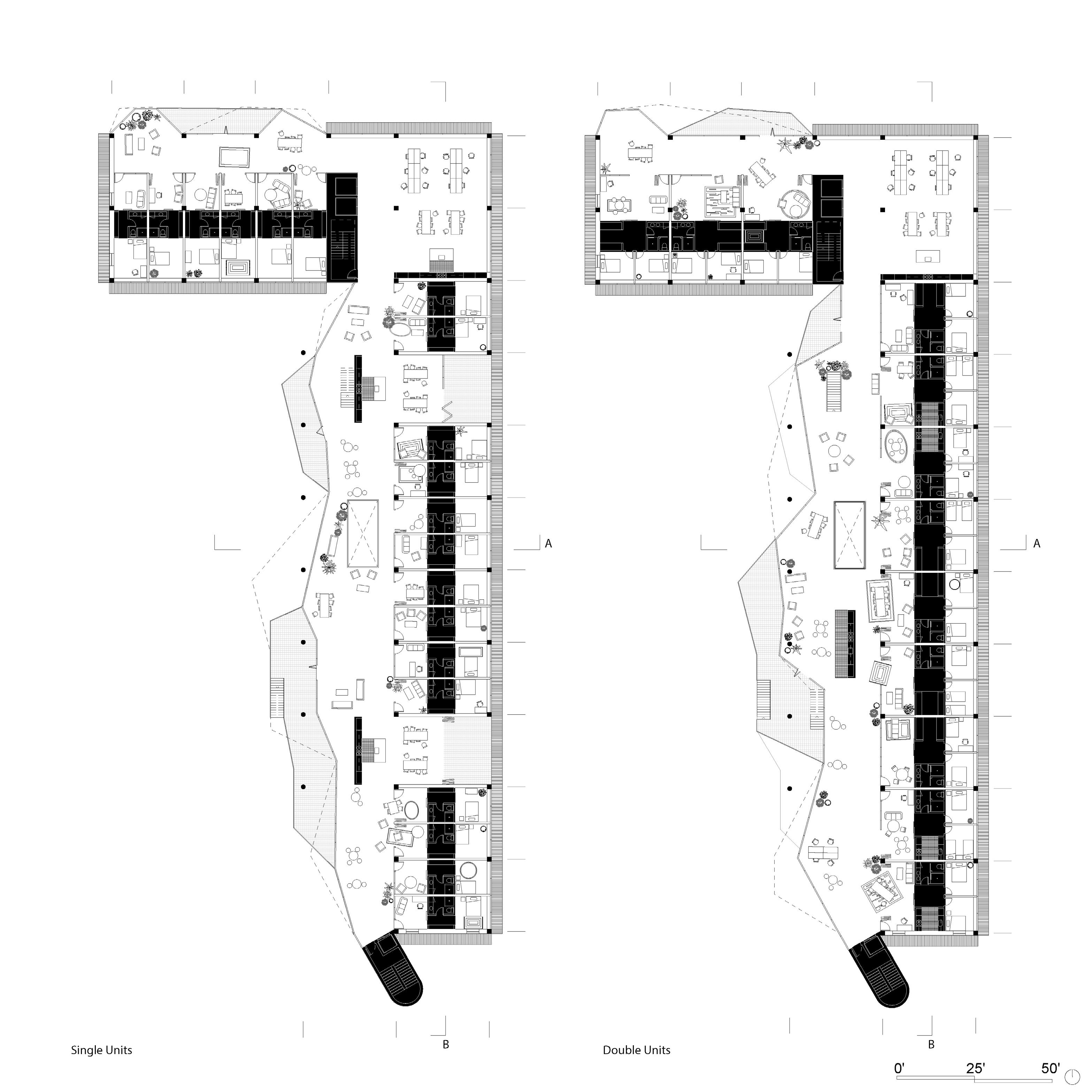 Shown here are two typical floor plans showing single and double units. Each has their own personal space but also has access to the resources of the rest of the floor. Shared areas for work, eating, cooking, and socializing bring clusters of units together, creating miniature collectives within the larger collection the building shelters.