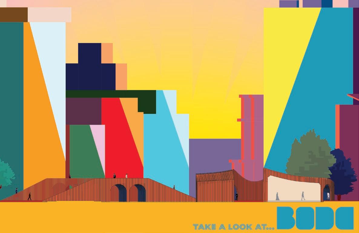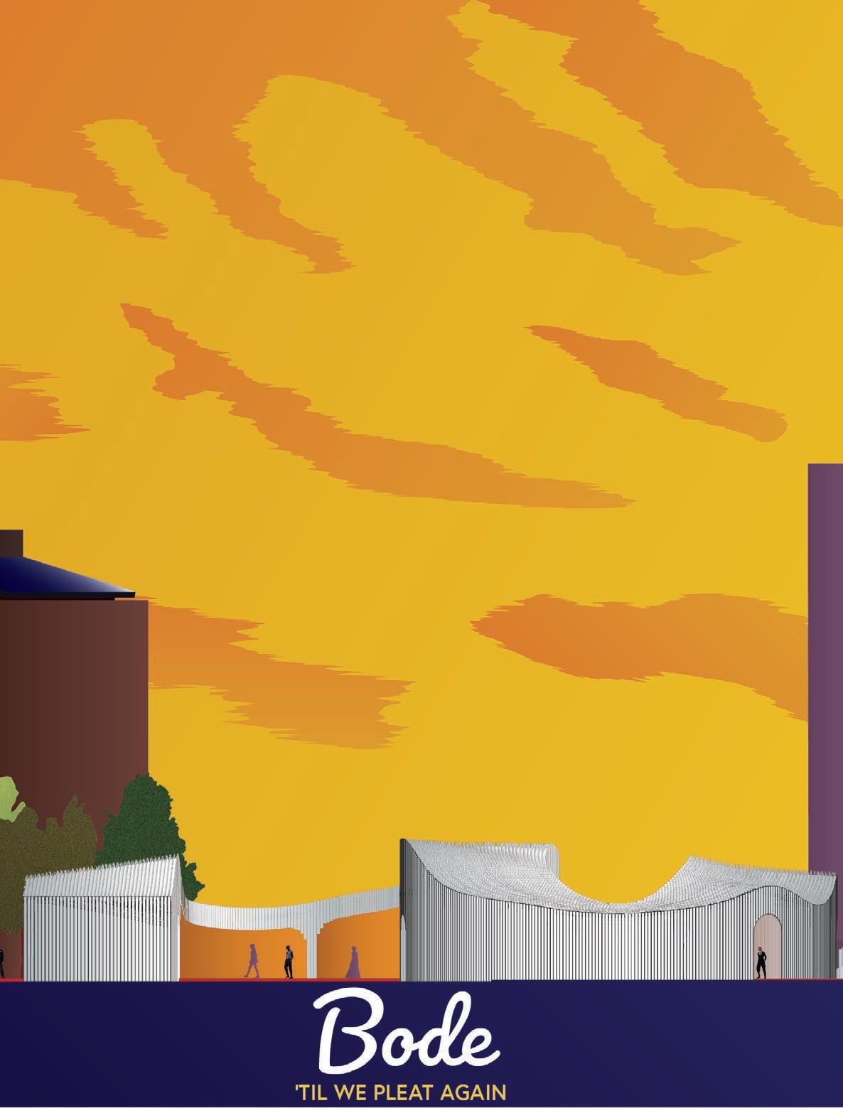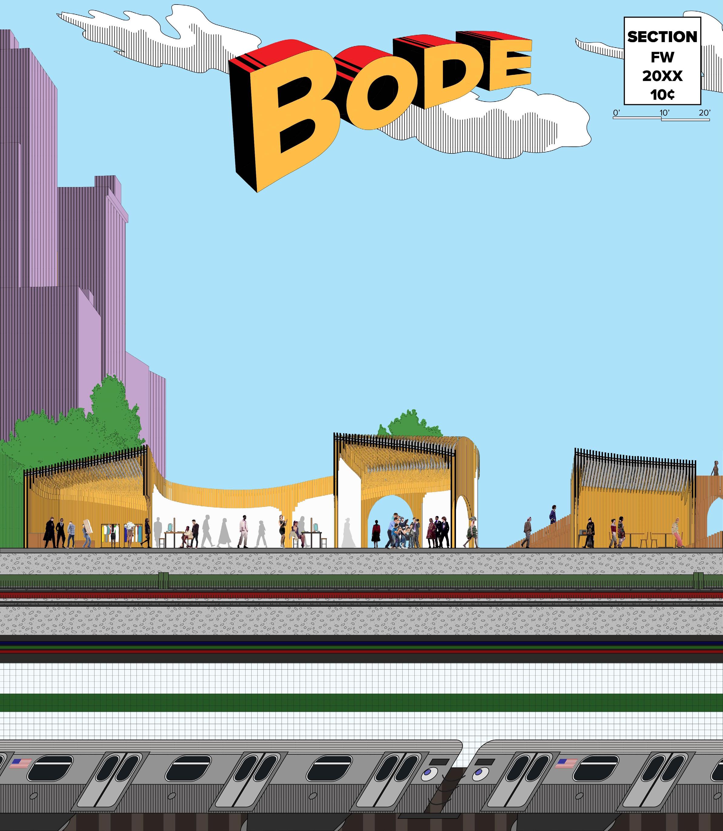 As a part of this assignment, our studio was encouraged to explore the presentation of our architectural drawings. In keeping with bode’s ethos, the elevations here are presented in the style of lithographic travel posters that could be used as promotional material for the show itself. The section (following page) draws from silver age comics for a bold look referencing bode’s inspirations and the city itself.