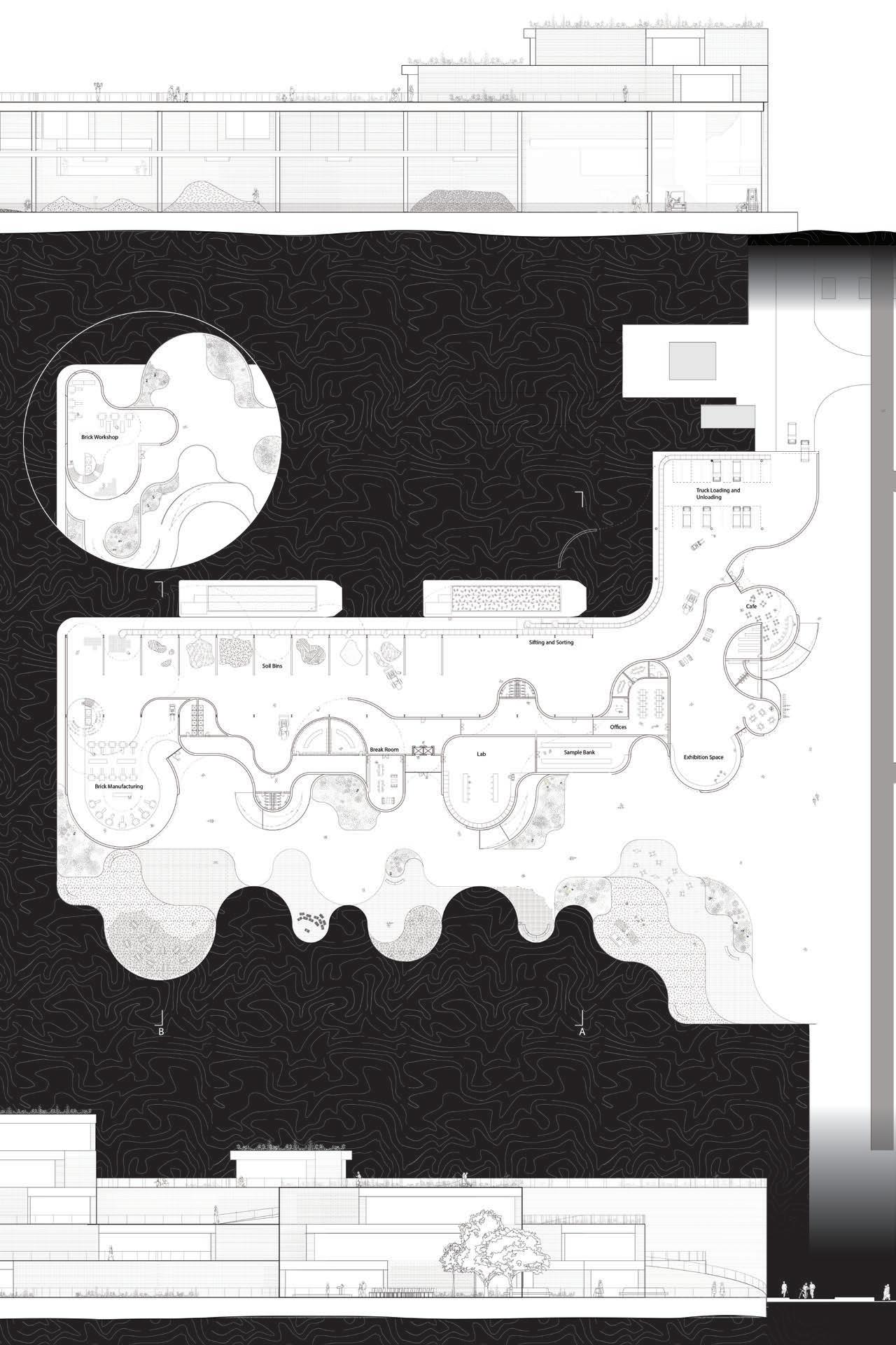 The curving form of the building is based on a module derived from the existing steel structure on the site, of which we chose to keep a portion of as a nod to the industrial past of the pier. The rounded forms serve to create inviting terraces for pedestrians to meander between and occupy with no sharp corners to deter visitors from finding their own path.