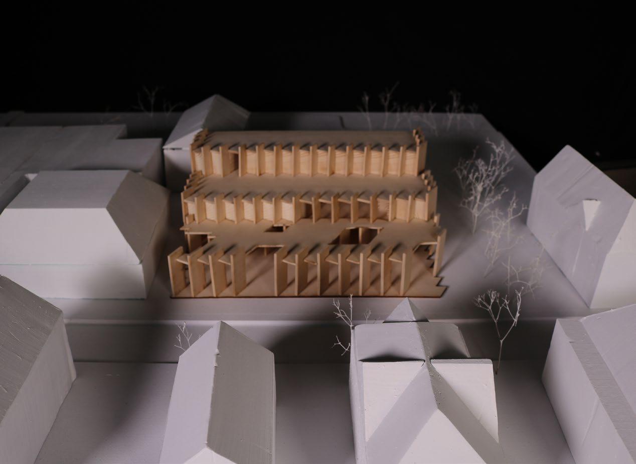 With the I-81 viaduct scheduled to come down in the near future, the entire class of 307 is tasked with designing housing to occupy the soon to be empty sites along the highway’s path. This project is a co-living project designed for an imagined collective of diverse age and background. The building aims to provide flexibility and comfort to individuals and groups by providing many shared amenities and opportunities to choose one’s own level of privacy. The individual units dissolve the living space into private areas along the street-facing facade, a strip of service spaces, and an operable living area in each unit that can be completely opened up to a larger band of shared space in each floor. This allows residents to choose how they interact with their peers and gives them flexibility day over day.