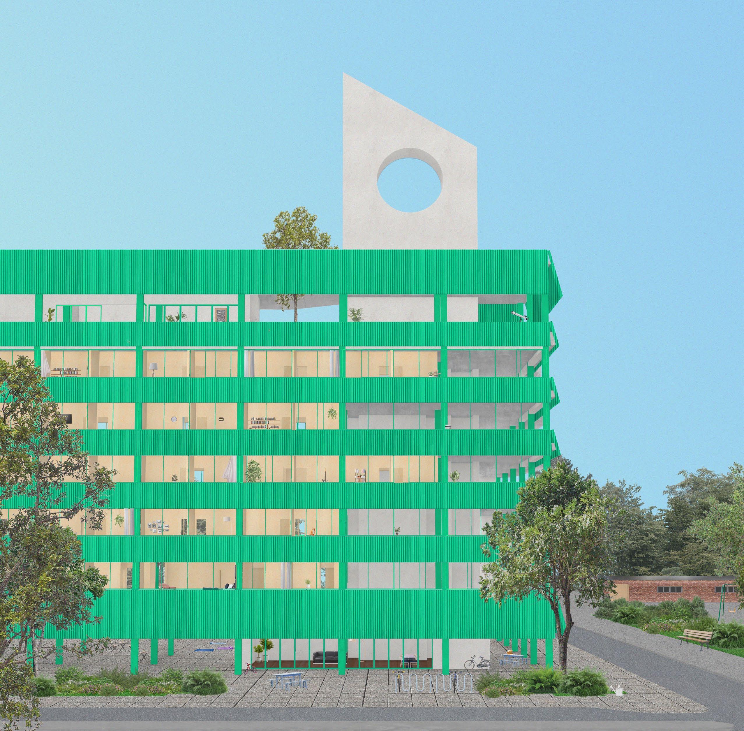 The large rear strip of space provides myriad opportunity for connection between groups of units, the floor as a whole, and the different levels through secondary vertical circulation and key spaces such as balconies and shared kitchens. The front facade presents a more typical appearance, reflecting the more rigid private areas within. The rear facade is much more detailed and dynamic, expressing the ever changing needs and happenings of the residents.