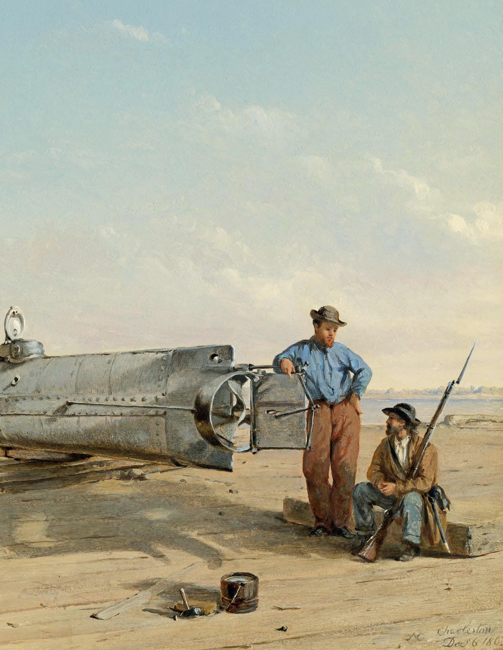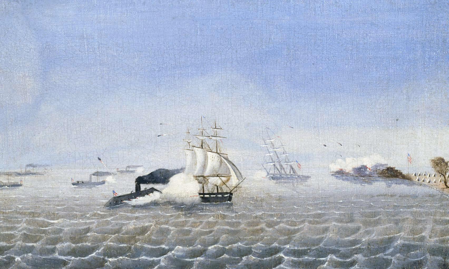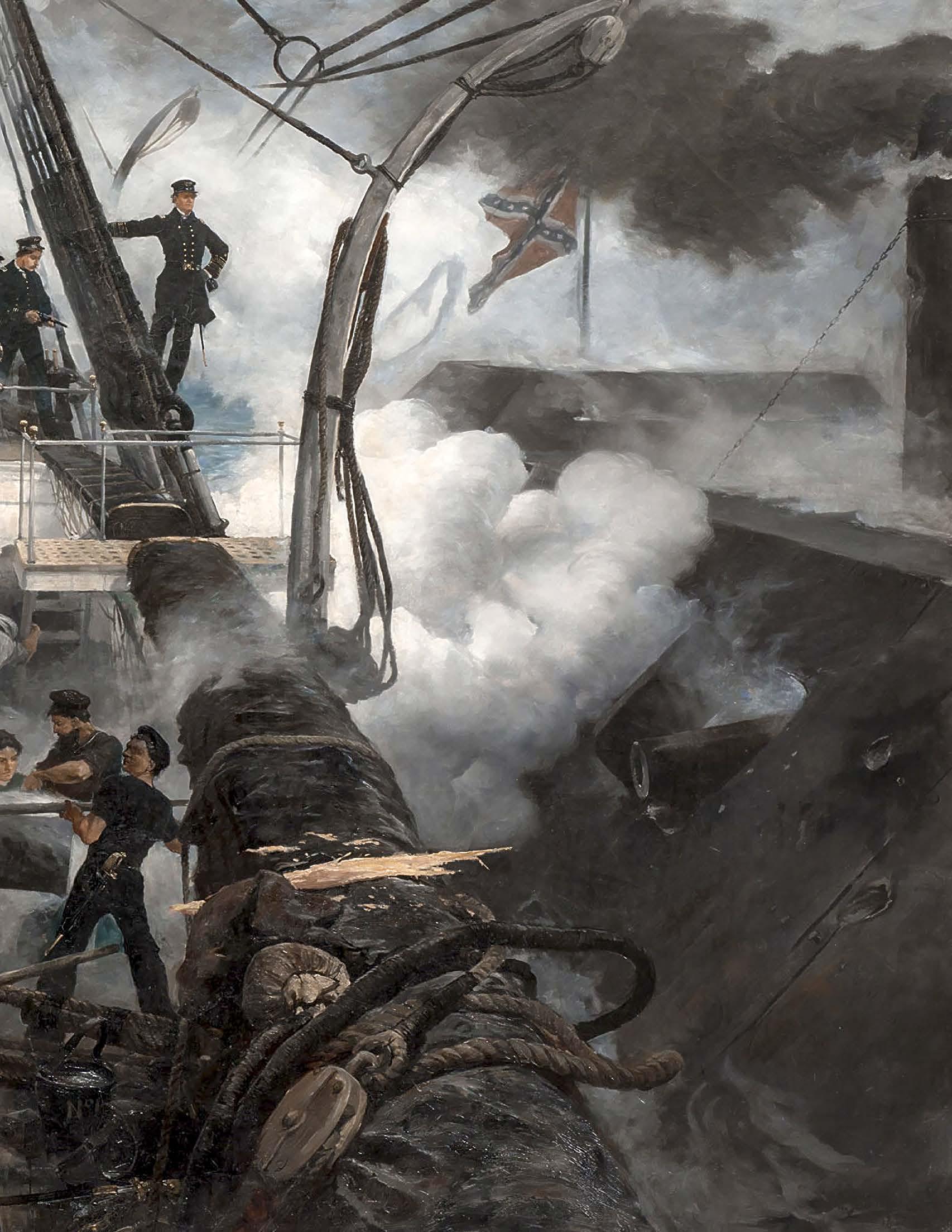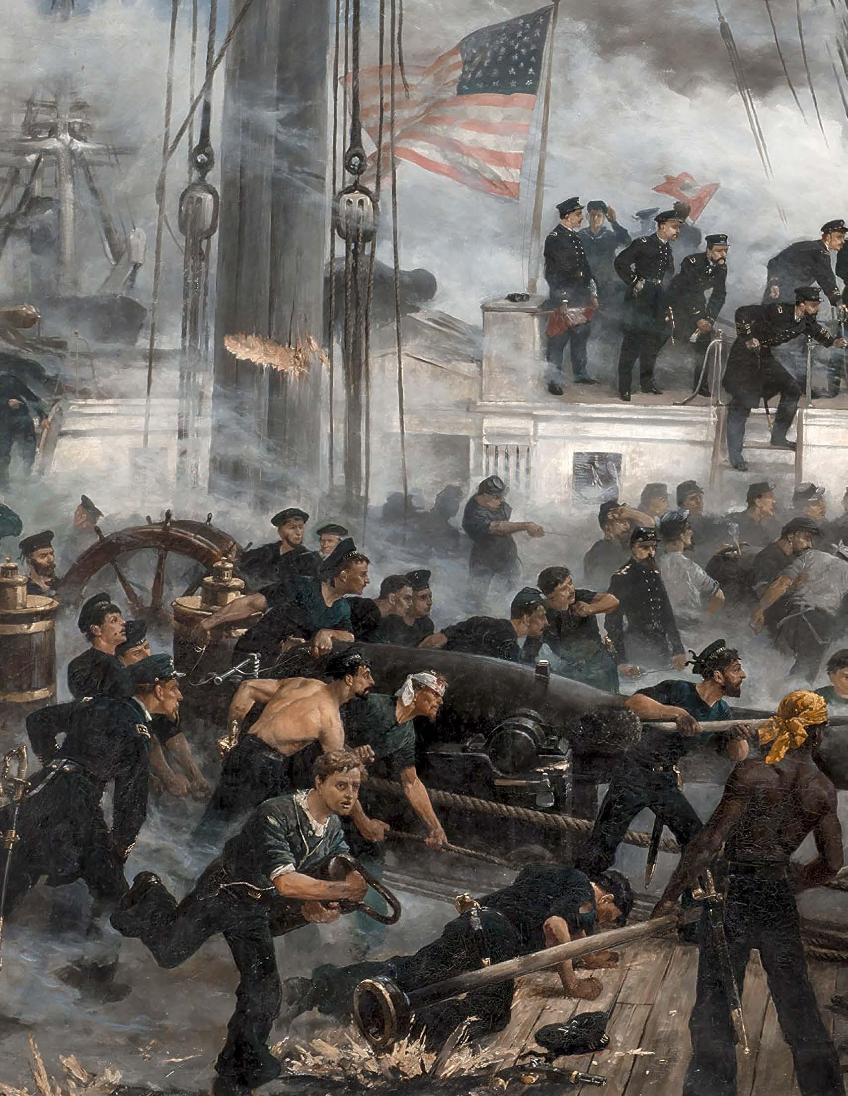 William Overend was commissioned by the Fine Art Society in London, England, to paint this massive (10 feet x 6.5 feet) painting. A British artist, Overend traveled to the United States to research the project, including sketching the USS Hartford warship, collecting photographs and uniforms, and interviewing survivors.