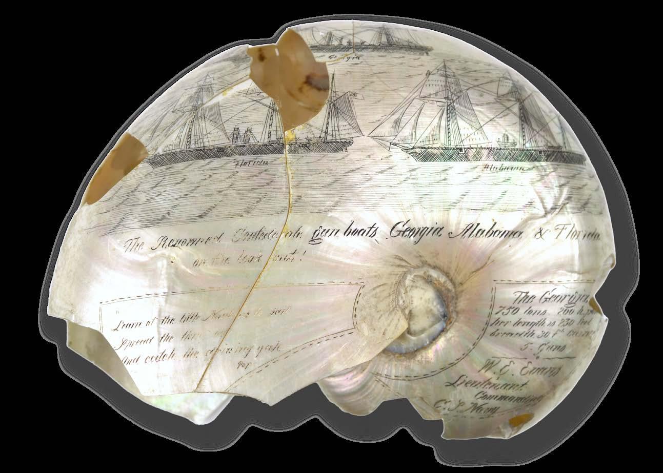 A Confederate sailor aboard CSS Georgia carved this shell and presented it to Lt. William E. Evans. The scrimshaw