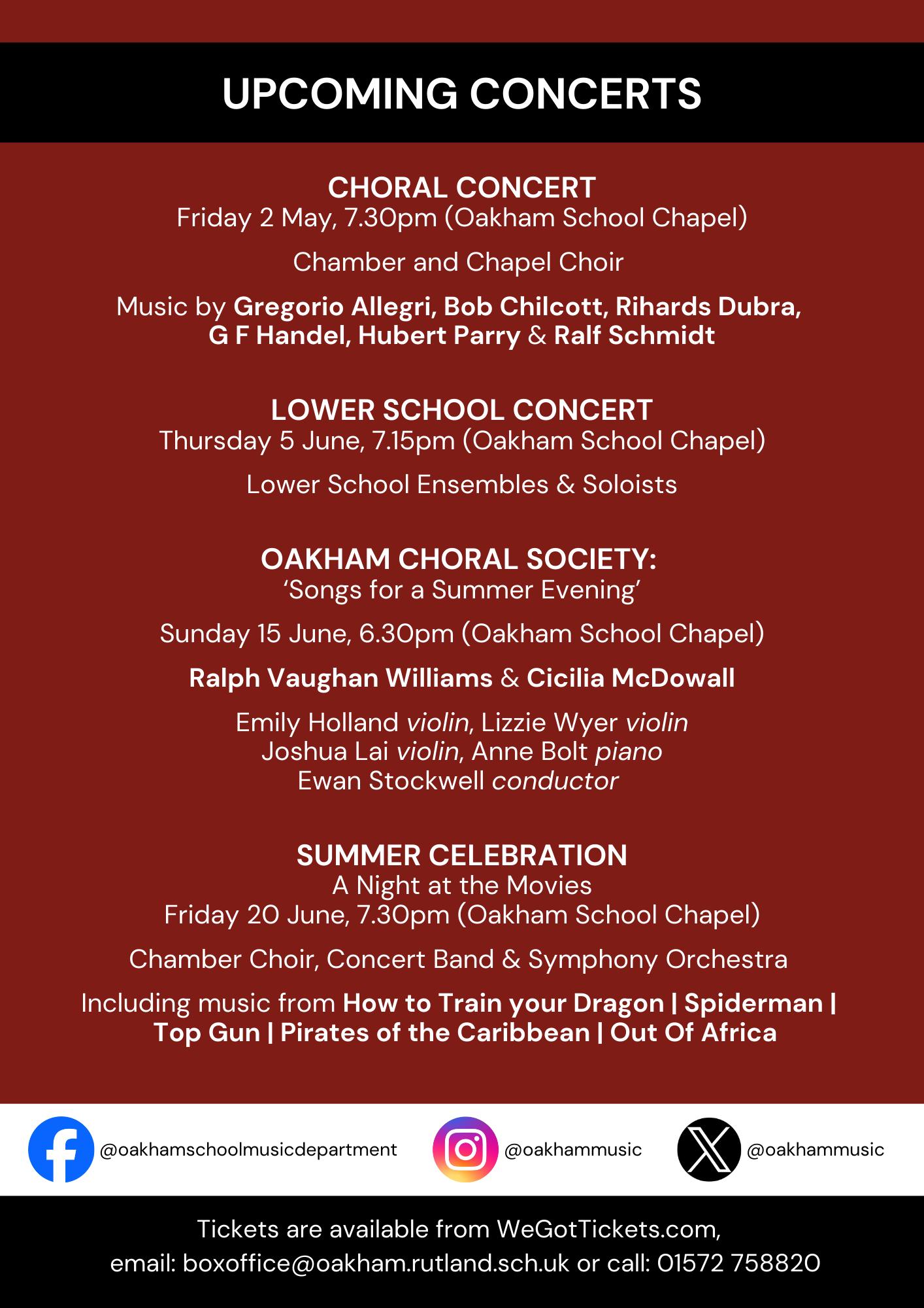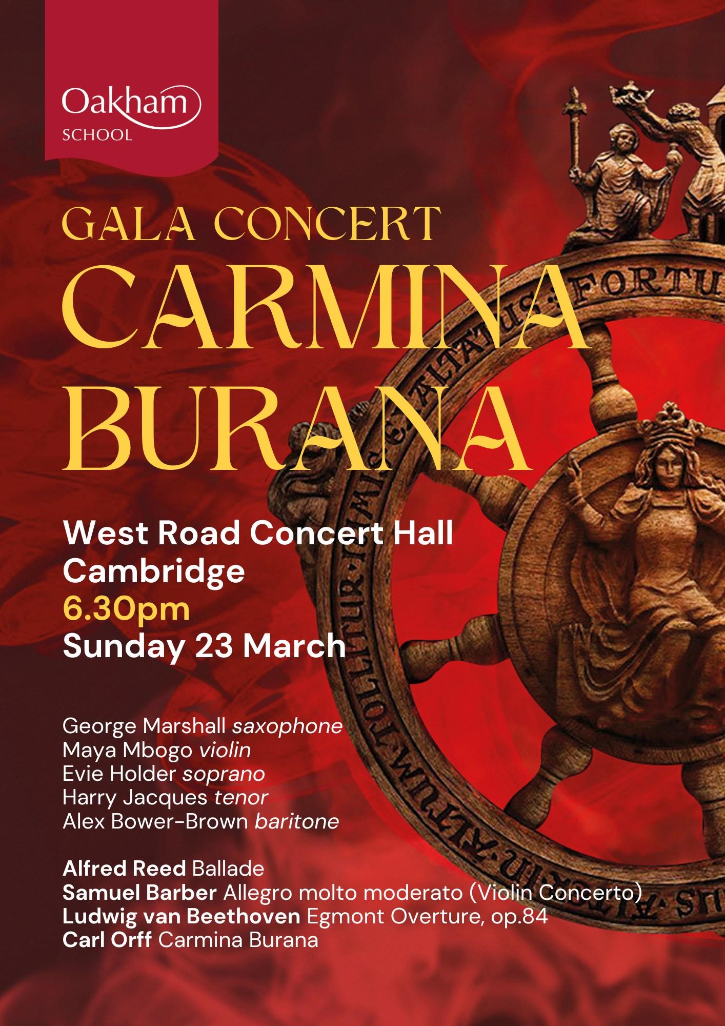 We look forward to a wonderful selection of music, spotlighting some of our leading Form 6 & 7 musicians, and bringing together our wider Oakham Community in tonightâs performance of Carmina Burana. Before that grand finale of song, we will enjoy the Schoolâs Concert Band and Symphony Orchestra, with contrasting programmes featuring English folk music arrangements by Ernest Tomlinson and the lyrical saxophone writing of Alfred Reed. Our Symphony Orchestra are proud to present Beethovenâs iconic âEgmontâ overture, followed by a movement of one of the great 20th century violin concertos by Samuel Barber.