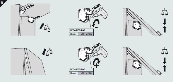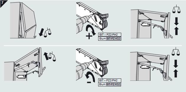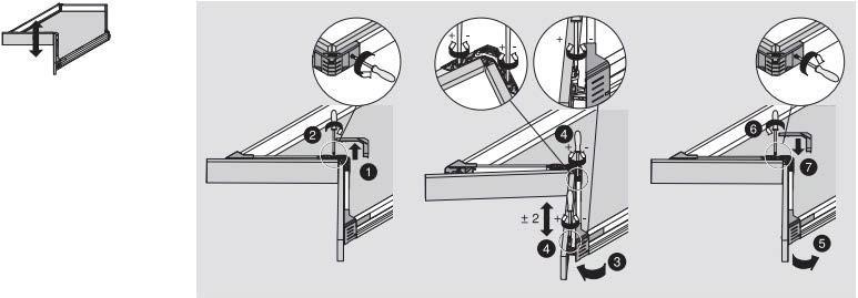 Benytt et stjerneskrujern på den nederste innvendige skruen fpresis og trinnløs regulering av frontens høydeposisjon. Fronten kan reguleres +/- 2mm på hver side.