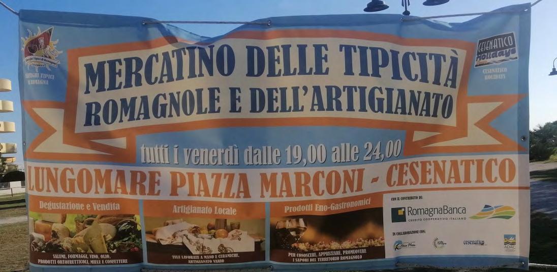 L’estate di Alberghi Tipici di Romagna ha visto riconfermati progetti ed eventi ormai consoli dati nell’agenda del gruppo, tra cui, lo storico Mercatino delle Tipicità Romagnole e l’organiz zazione delle escursioni nell’en troterra. Giunto ormai alla sua XVII edizione, il Mercatino delle Tipicità, che si svolge nella Piazza Marconi intorno alla statua di Marco Pantani, nasce dal deside rio di “raccontare” ai turisti la nostra Romagna, una terra sin cera e passionale, ricca di piatti e prodotti che sono l’espressione del suo territorio. Tra i prodot ti enogastronomici tipici della Romagna che vengono proposti spiccano i salumi, i formaggi di fossa, le farine e le marmellate ,il miele, la frutta e verdura, il vino e l’artigianato locale con le tele stampate.