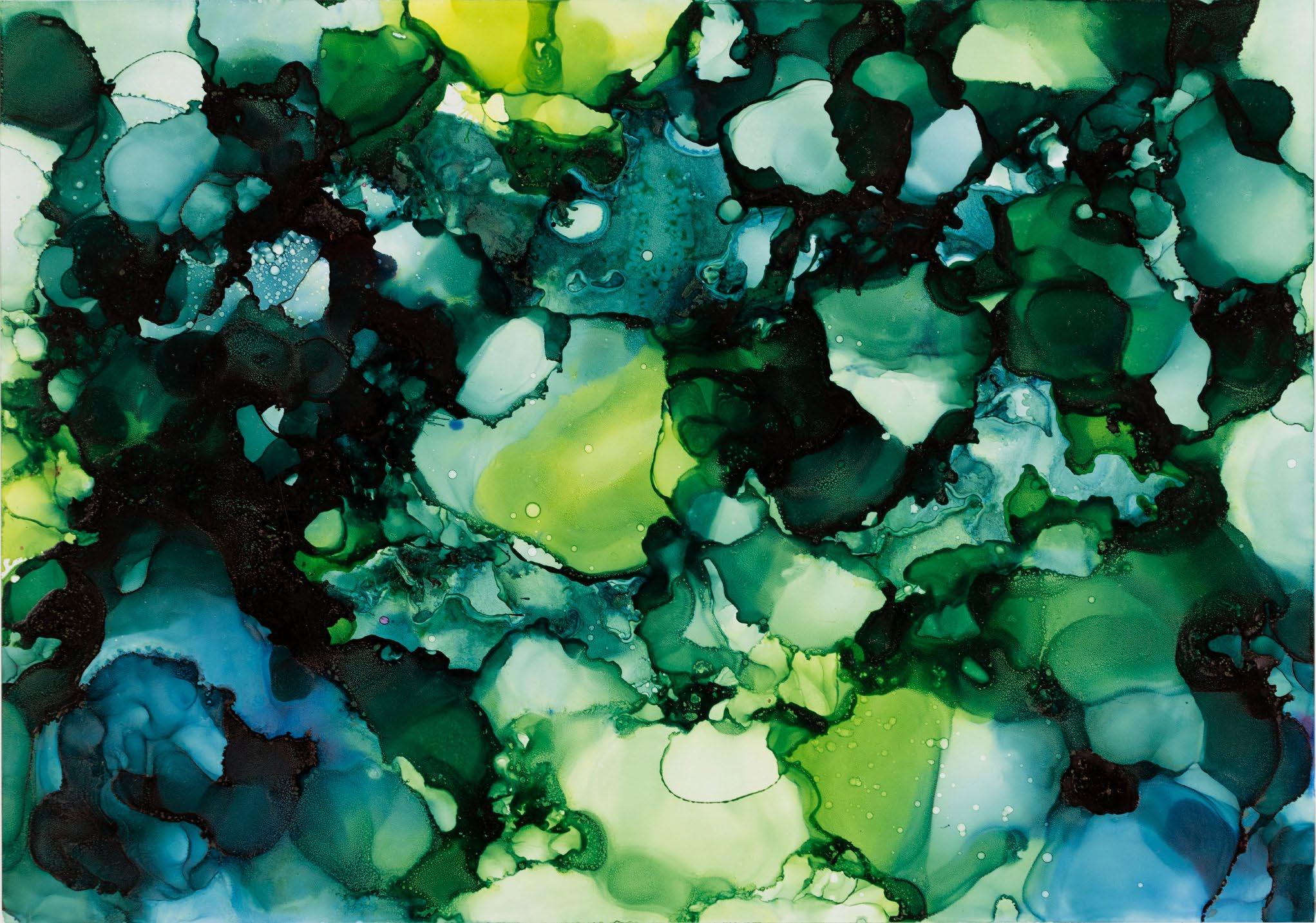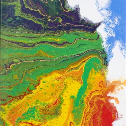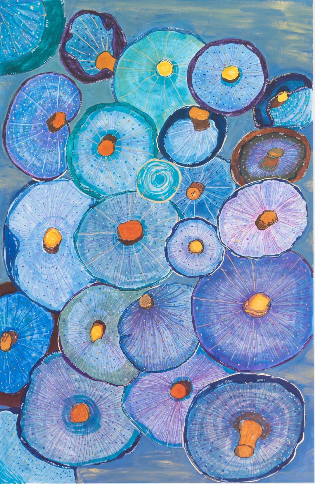 乾透的塑膠彩層層疊上成 半球體,畫出細緻花蕊,猶如 看到複雜內心,嚮往藝術世界的 隨心意境。螢光淺藍及流動的 筆法畫出海闊天空,光亮而充滿 動感,突出空中蒲公英自由 自在地隨風飄蕩,去到每個有 風的地方,看到更高更遠的 天空。