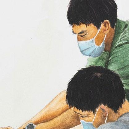 我看見導師發掘一位受限於肢體 殘疾的學員有進行木工訓練的 能力。經導師指導下,學員 很用心地投入訓練,展現出 「天生我材必有用」的精神, 這情景觸動了我的心弦,畫下 這動人的景象。