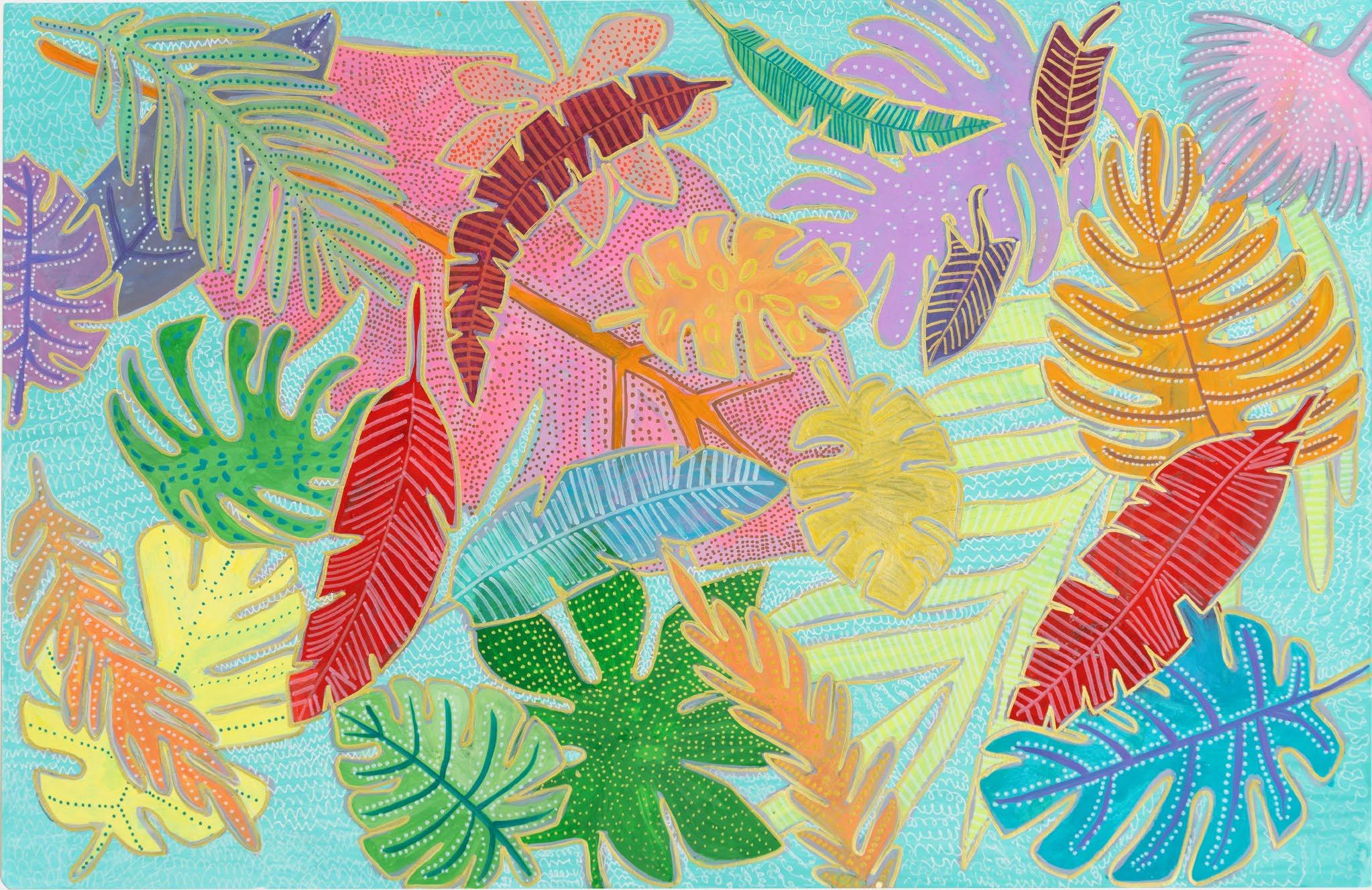 Arrays of leaves are illuminated by the piercing sunlight, reflecting vibrant colours upon their surfaces in the jungle.