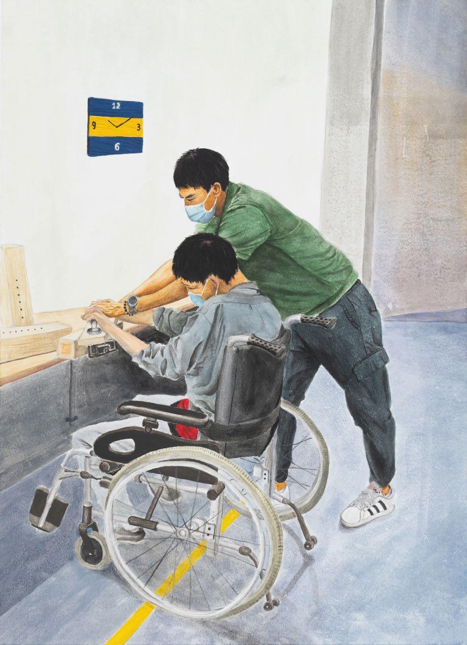 I witnessed a scene where a mentor explored the woodworking talent of a student with physical disability. Under the mentor's guidance, the student put a lot of effort and passion into the training, demonstrating the spirit of ‘all things in their being are good for something.’ This heart-warming sight deeply resonated with me, inspiring me to draw this touching scene.