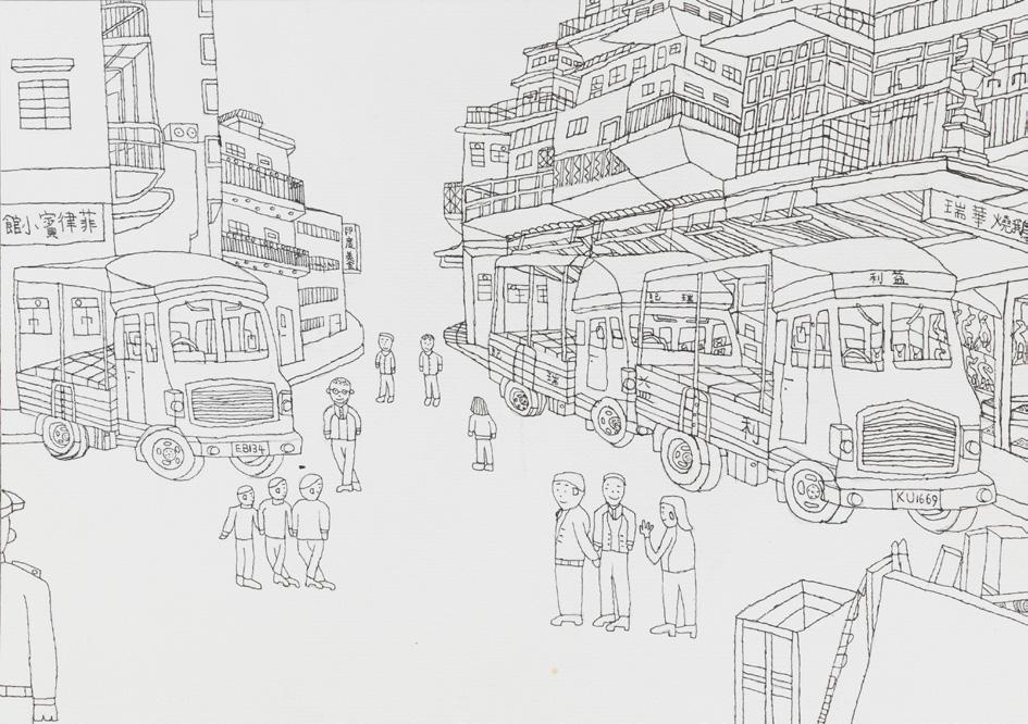 The artwork highlights both the tranquillity and vibrancy of Hong Kong’s neighbourhoods, where people, vehicles, and buildings coexist harmoniously, much like old friends. This unique harmony arises from the emotional bonds shared among community members.
