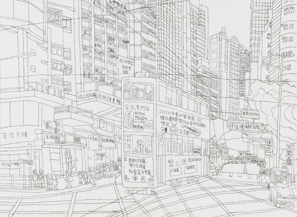 The artwork is an urban symphony centred around the tram. The interwoven cables, layered signboards, and the ceaseless flow of traffic create a strong sense of dynamic rhythm, conveying the uplifting spirit brought by the pulse of the city.