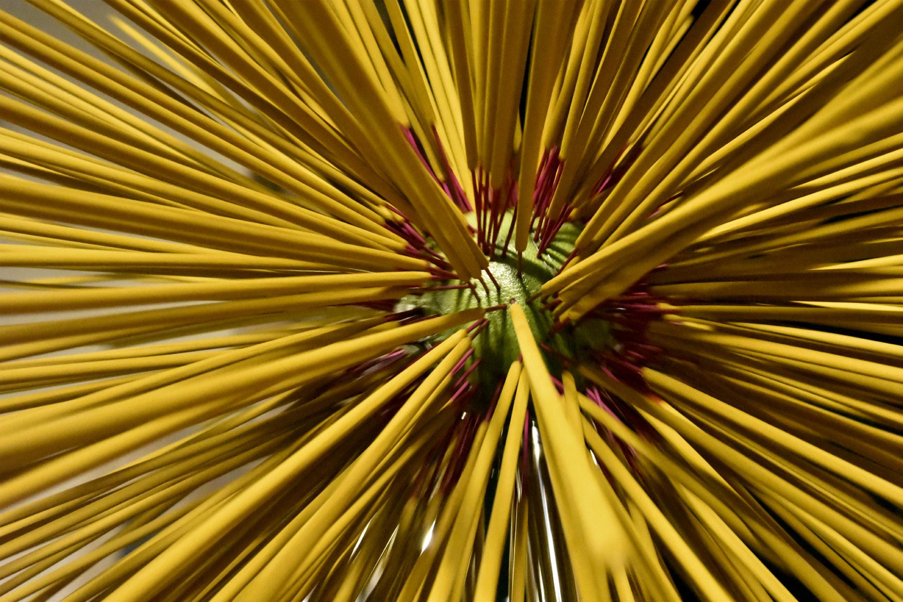 火龍是香枝插滿沙田柚而成,縷縷炊煙輕舞。點燃之際,高速轉動幻化為一顆 火的龍珠。旋轉間,笑容於火焰中綻放,宛若火龍低語,又似笑意盎然的情景。 The fire dragon is crafted by inserting incense into pomelos, with wisps of smoke dancing lightly. When lit, it spins at high speed, transforming into a blazing dragon ball. As it rotates, smiles bloom within the flames, as if the fire dragon whispers softly or a joyful scene unfolds in the firelight.