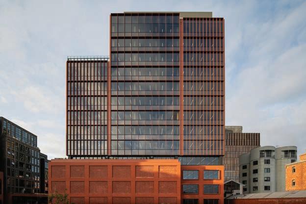 Our design draws on this distinctive context to create a building comprising a 5-level brick and concrete podium with a 10-12 19-level lightweight mass timber structure perched above. A contextual response as well as a direct re ection of the building’s structural composition. The brick podium sleeves into its streetscape scale, while the glazed curtain wall tower above speaks to an emerging typology of residential/commercial buildings in the immediate surrounds. A de ning move was to align the northern façade of the podium with a heritage building to the east, creating a wider ground plane with a generous arrival and civic quality. The tower forms above cantilevers over this setback to de ne an entry pathway.