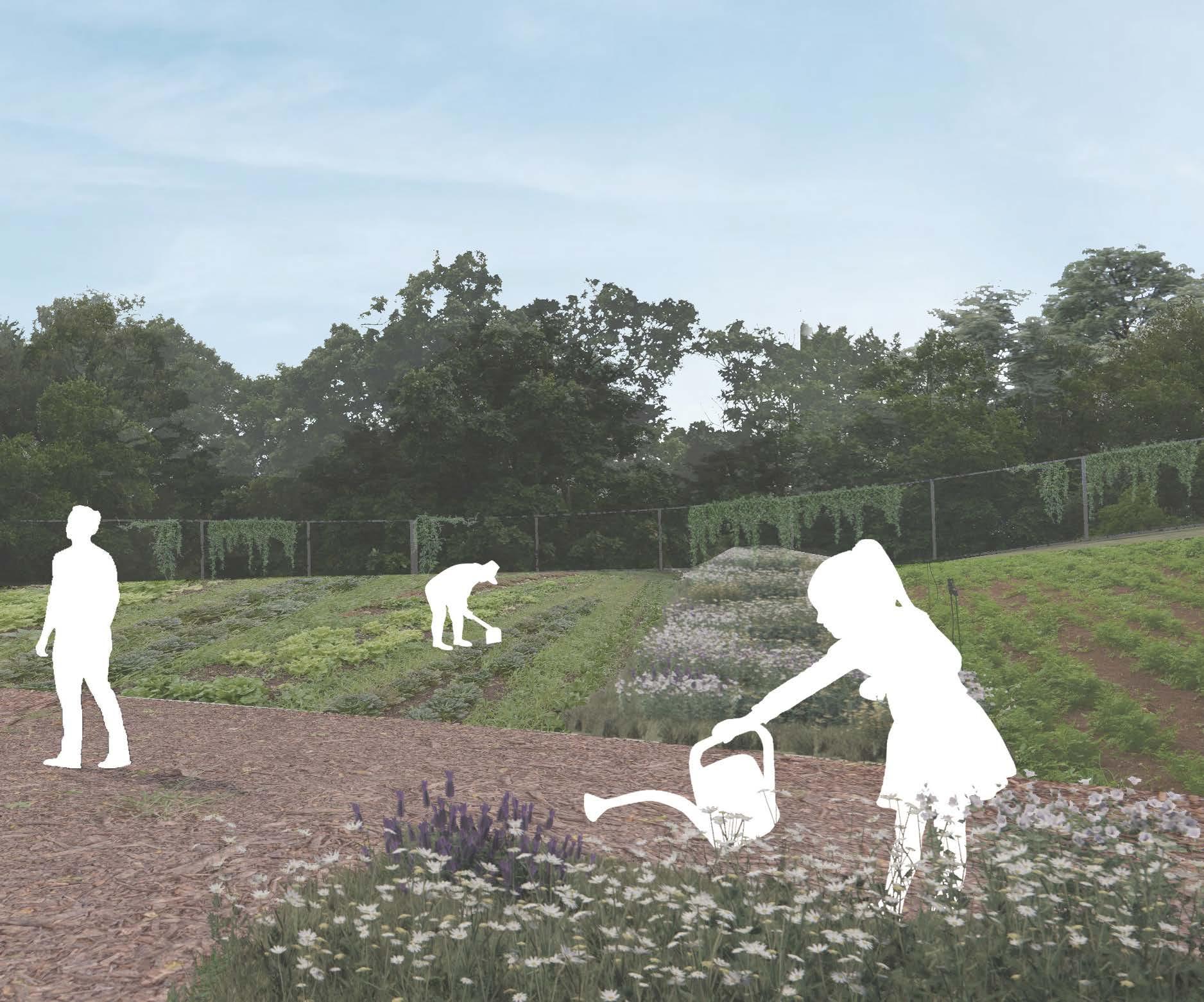The master plan focuses on connectivity and ecological restoration, with efforts to restore the prairie by removing invasive species and replanting native vegetation. Pollinator pathways integrated into farming stations support bees and other pollinators, reinforcing the farm’s connection to nature. These elements enhance the ecosystem while fostering education and engagement in urban farming.