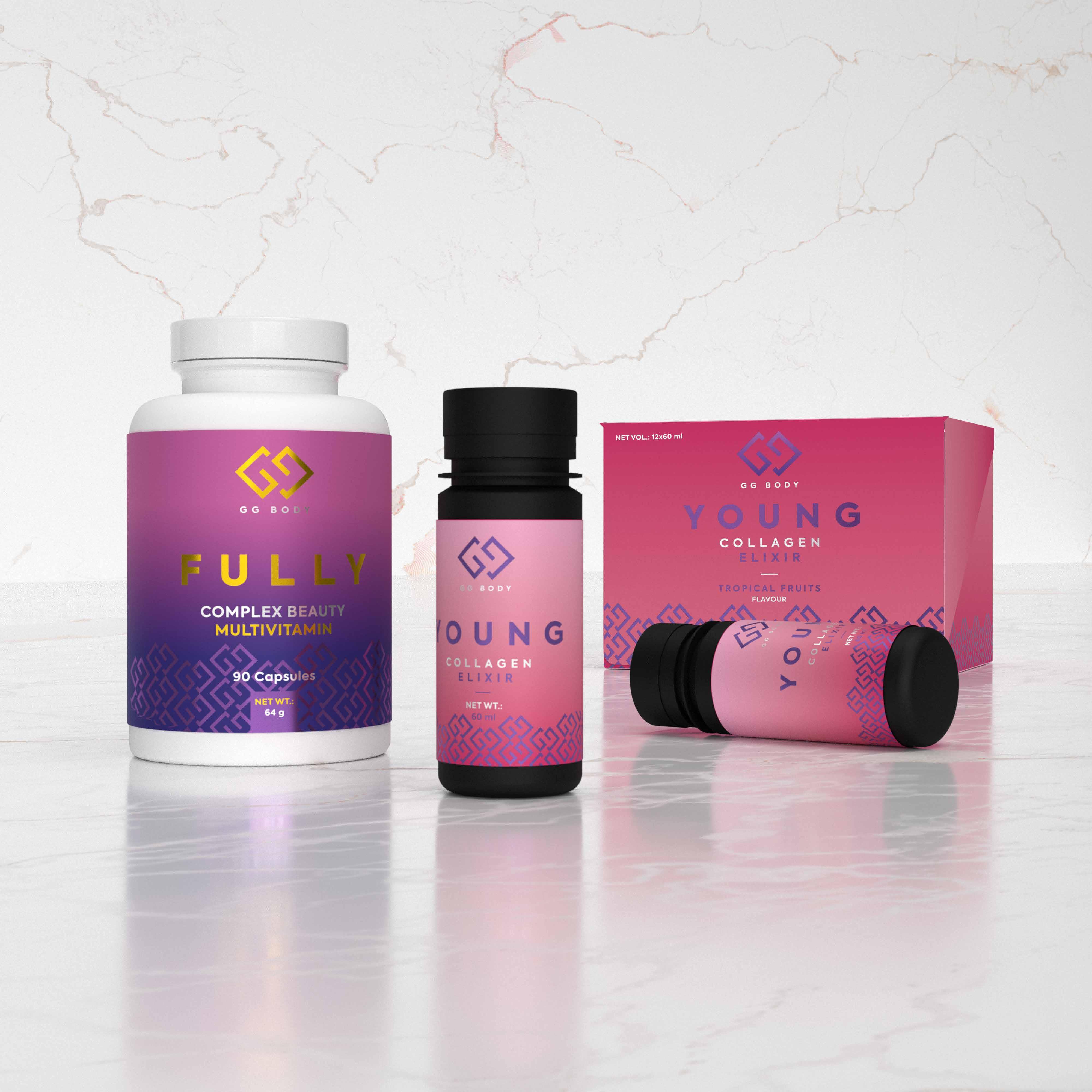 A csomag tartalma: 1 doboz GG Body BODYHACK, 1 doboz GG Body YOUNG Collagen Elixir (12 shot), 3 doboz GG Body YUMMY Protein Fiber Pudding (1 db Chocolate-Raspberry ízű, 1 db Strawberry ízű, 1 db Blueberry Cheescake ízű), 1 doboz GG Body FULLY Complex Beauty Multivitamin, 1 db ABS/TENSE Toning&Firming Cream, 1 db BOOTY/BOOSTER Push up&Anti Cellulite Cream