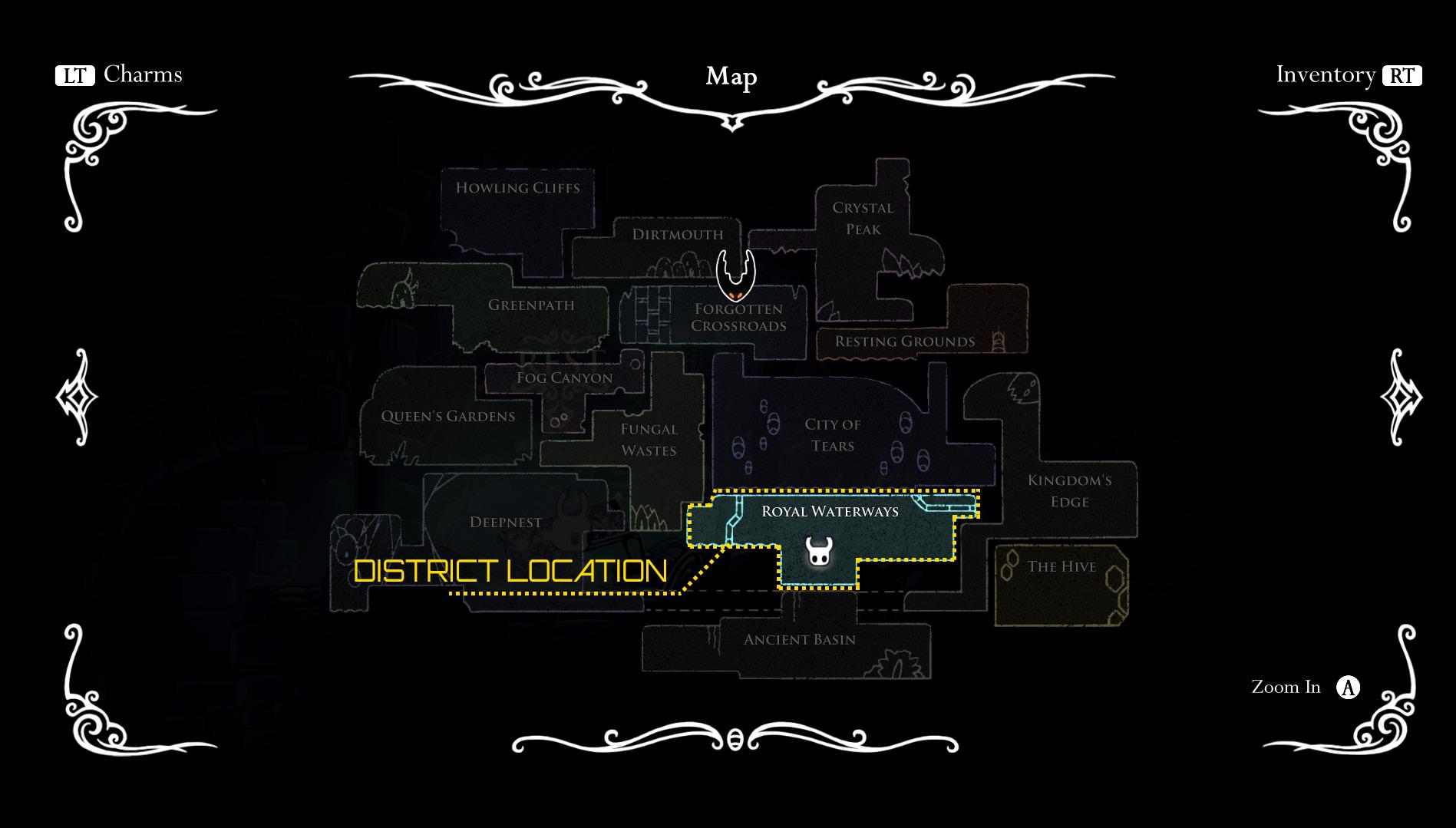 027 GAME : HOLLOW KNIGHT MAP : ENLARGED GAME : HOLLOW KNIGHT MAP : FOCUSED MAP TYPE : SECTIONAL AREA : ROYAL WATERWAYS GAME : HOLLOW KNIGHT PHOTO : RELATION OF PLAYER TO MAP 33 34 35