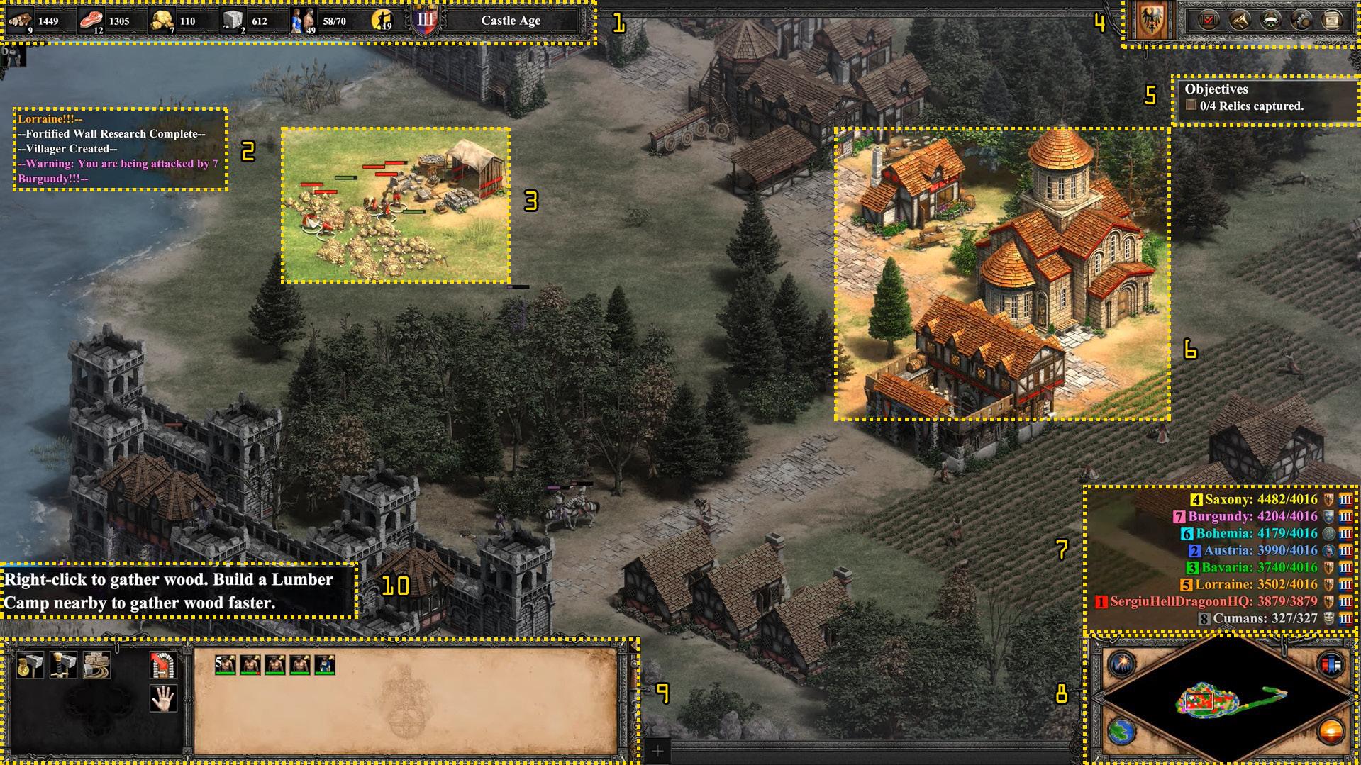 Age of Empires is a classic RTS (RealTime Strategy) city-builder game in which the player begins with a handful of hunters and gatherers. In order to develop a society and eventually a civilization, the player must manage resources and gather them from around the map while building his or her base. This also involves raising armies and moving them around maps to discover new land, or invade inhabited land. This process is facilitated through the map and its full integration with the gameplay allows the player be the overseer of the environment and all of its resources.