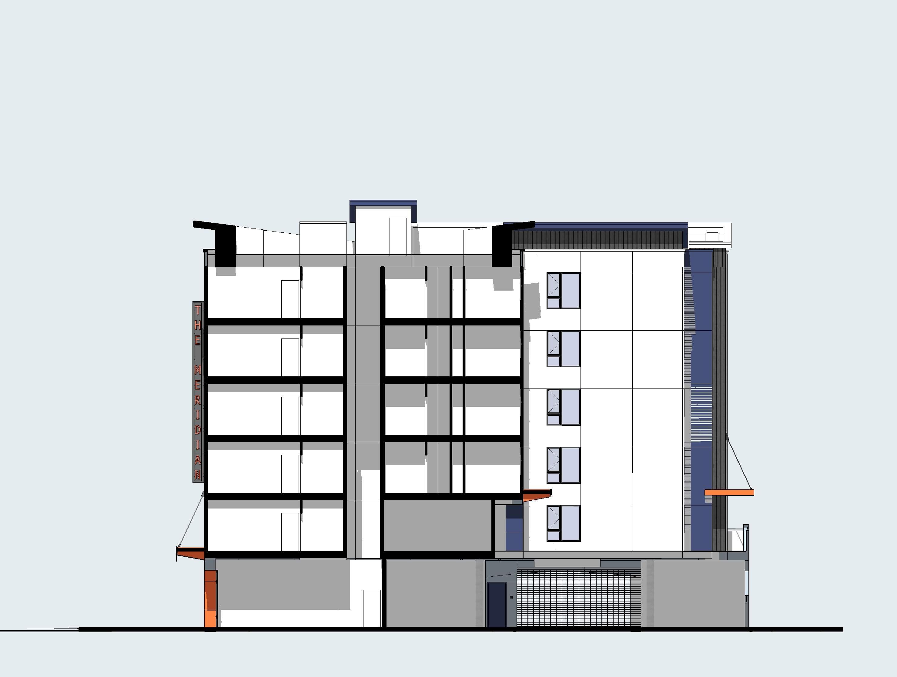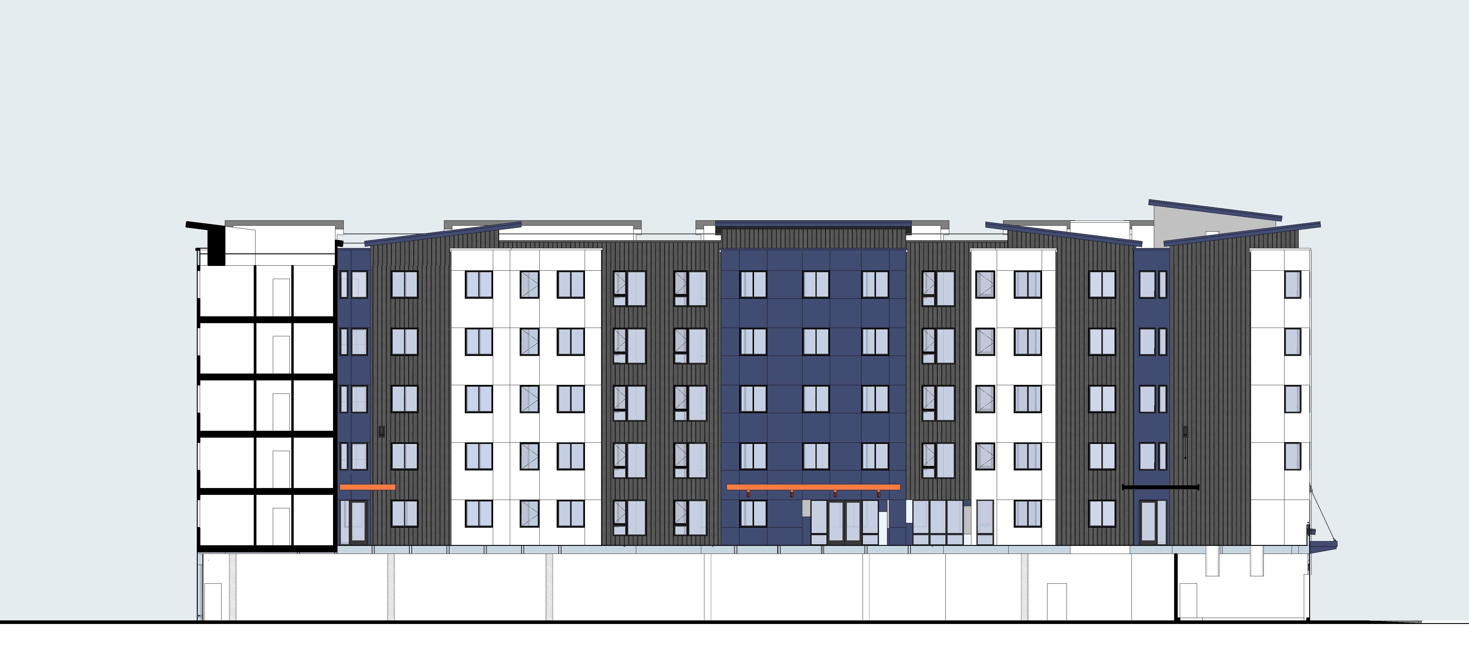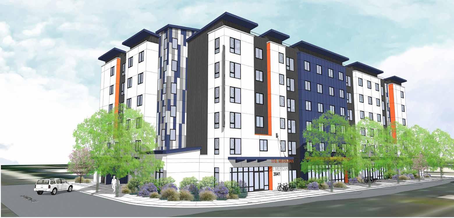 The Meridian is a 59-unit, all electric affordable housing development located at the corner of Stevens Creek Boulevard and Buckingham Drive in Santa Clara. This large family housing development has a mix of one, two, three, and four-bedroom units wrapped around a central podium courtyard. The multi-purpose community room spills out onto the podium courtyard where play areas will be provided for residents consistent with CDLAC and TCAC requirements. The building is six stories, with five stories of residential units located over ground floor garage parking and residential amenity space. The ground floor is designed to have a strong storefront presence along Stevens Creek Boulevard. It will be activated by residential lobby, mail, office areas, and secured bike storage.