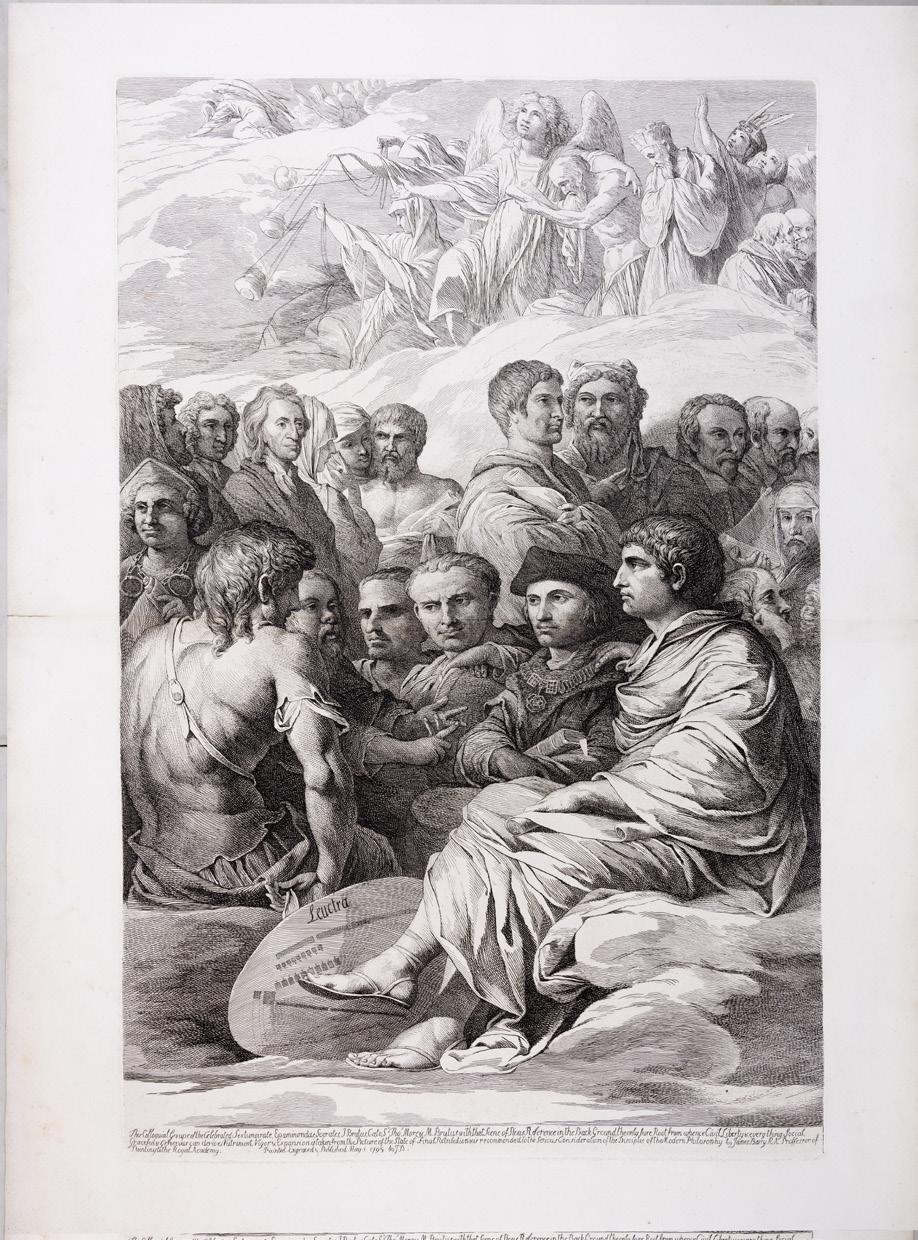 After completing the six canvases in the Great Room of the Royal Society of Arts, James Barry extended his work through a series of six large engravings in 1802. These prints revisited and expanded upon the themes explored in the original paintings, delving deeper into the ideas of human progress, virtue, and divine justice. The engravings were published under the title A Series of Etchings by James Barry, Esq., from his Original and Justly Celebrated Paintings in the Great Room of the Society of Arts.