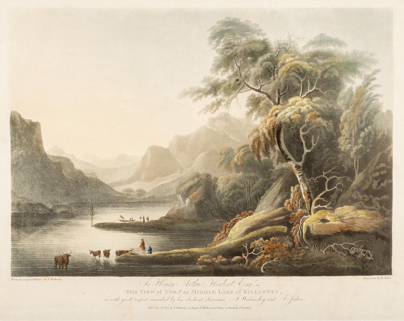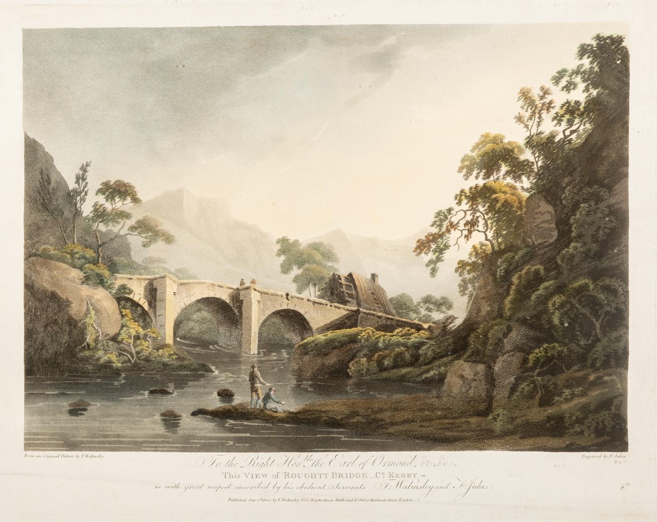 From the series Views of Killarney (1795–1802), published: Roughty Bridge, County Kerry – 1 January 1800 by T. Walmsley, 15 Argyle Street, Bath, and F. Jukes, London; Torc or Middle Lake, Killarney – 1 March 1802 by James Daniell, London. T. Walmsley, del.; F. Jukes, fecit.T. Walmsley, del.; F. Jukes, fecit.