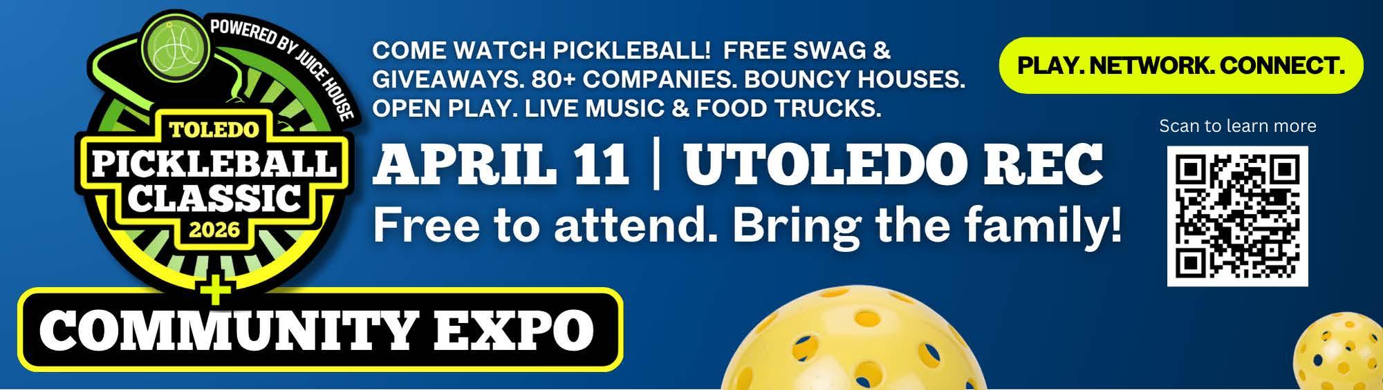 Juice House at the University of Toledo is hosting the 2026 Toledo Pickleball Classic and Career Futures Expo on April 11. The event will take place at the University of Toledo Main Campus from 7am-5pm. The tournament includes four levels of play: a free kids clinic for ages 7-13, a high school bracket, a UToledo student organization bracket and a company and organization bracket. Visit www.juicehouse.org/pickleballclassic/ for more details.