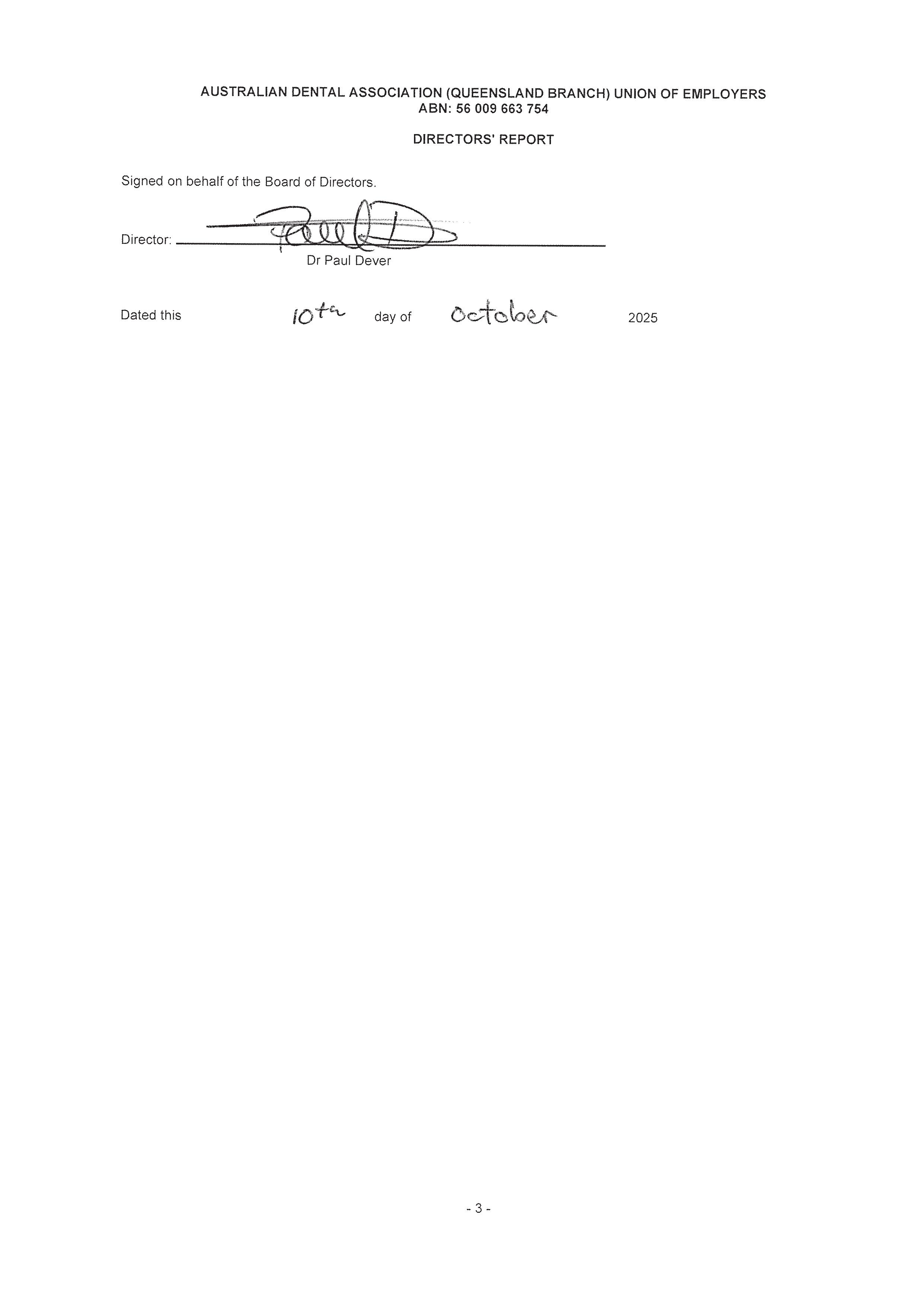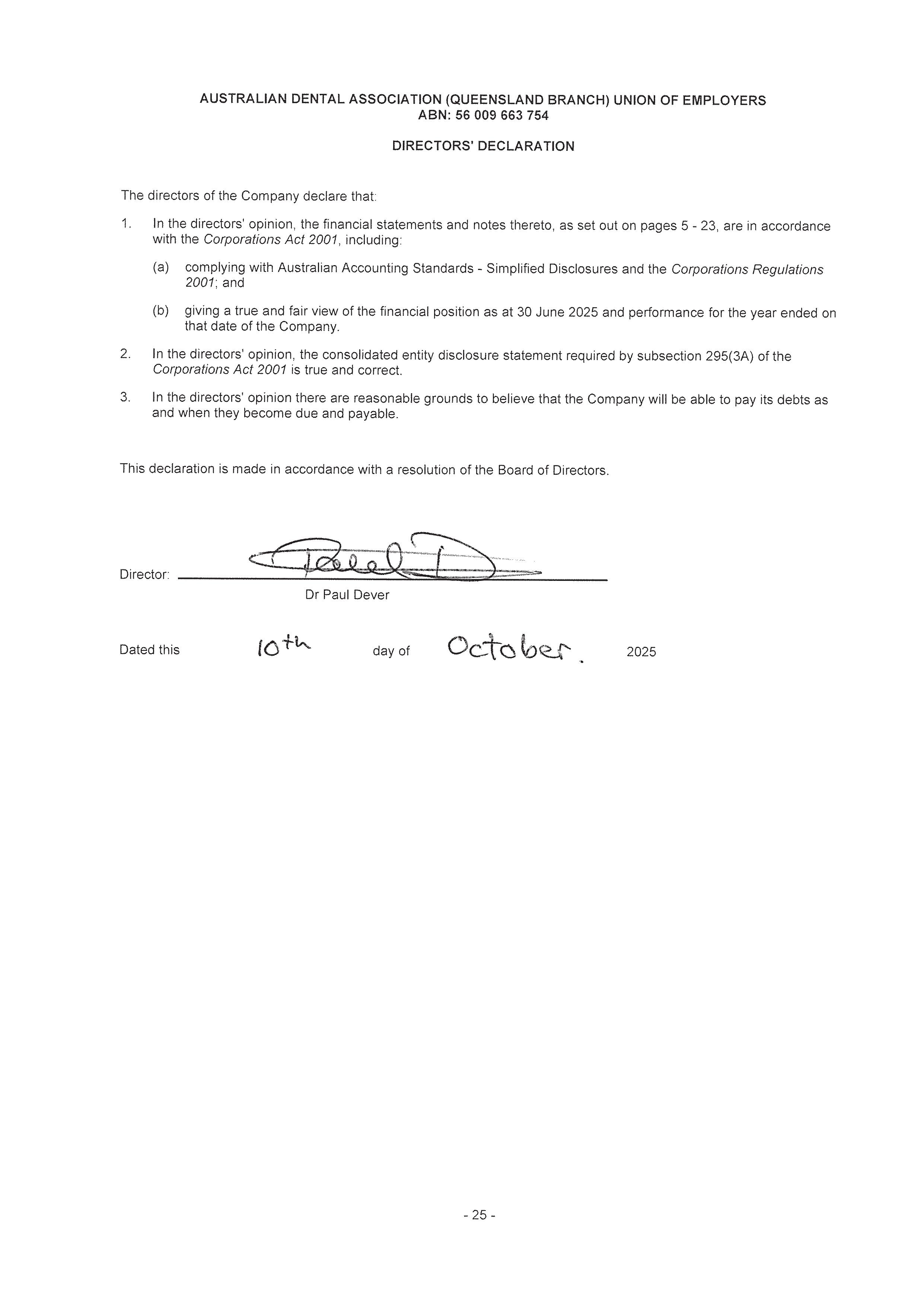We have audited the financial report of the Australian Dental Association (Queensland Branch) Union of Employers (“the Company”), which comprises the statement of financial position as at 30 June 2025, the statement of profit or loss and other comprehensive income, the statement of changes in equity and the statement of cash flows for the year then ended, and notes to the financial statements including material accounting policy information, the consolidated entity disclosure statement and the directors’ declaration.