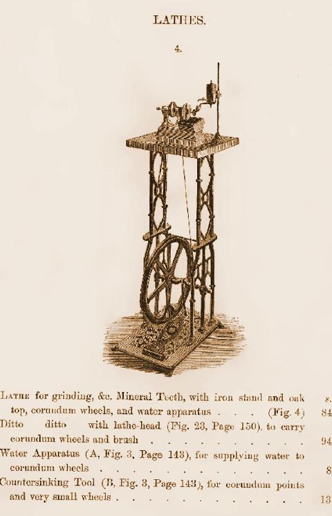 Lathe no. 4 pictured here is listed as a Lathe for grinding Mineral Teeth, with iron stand and oak top, corundum wheels and water apparatus. Ward’s lathe stand matches this one, however the lathe head itself is a later object and was used for polishing vulcanite.