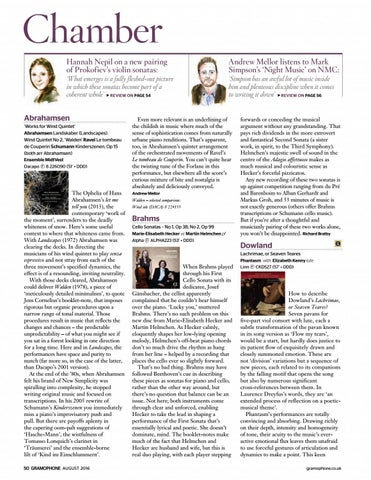 The Ophelia of Hans Abrahamsen’s let me tell you (2013), the contemporary ‘work of the moment’, surrenders to the deadly whiteness of snow. Here’s some useful context to where that whiteness came from. With Landscapes (1972) Abrahamsen was clearing the decks. In directing the musicians of his wind quintet to play senza espressivo and not stray from each of the three movement’s specified dynamics, the effect is of a resounding, inviting neutrality. With those decks cleared, Abrahamsen could deliver Walden (1978), a piece of ‘meticulously detailed minimalism’, to quote Jens Cornelius’s booklet-note, that imposes rigorous but organic procedures upon a narrow range of tonal material. Those procedures result in music that reflects the changes and chances – the predictable unpredictability – of what you might see if you sat in a forest looking in one direction for a long time. Here and in Landscapes, the performances have space and purity to match (far more so, in the case of the latter, than Dacapo’s 2001 version). At the end of the ’80s, when Abrahamsen felt his brand of New Simplicity was spiralling into complexity, he stopped writing original music and focused on transcriptions. In his 2005 rewrite of Schumann’s Kinderszenen you immediately miss a piano’s improvisatory push and pull. But there are payoffs aplenty in the capering oom-pah suggestions of ‘Hasche-Mann’, the wistfulness of Tomasso Lonquich’s clarinet in ‘Träumerei’ and the ensemble-borne lilt of ‘Kind im Einschlummern’. 50 GRAMOPHONE AUGUST 2016