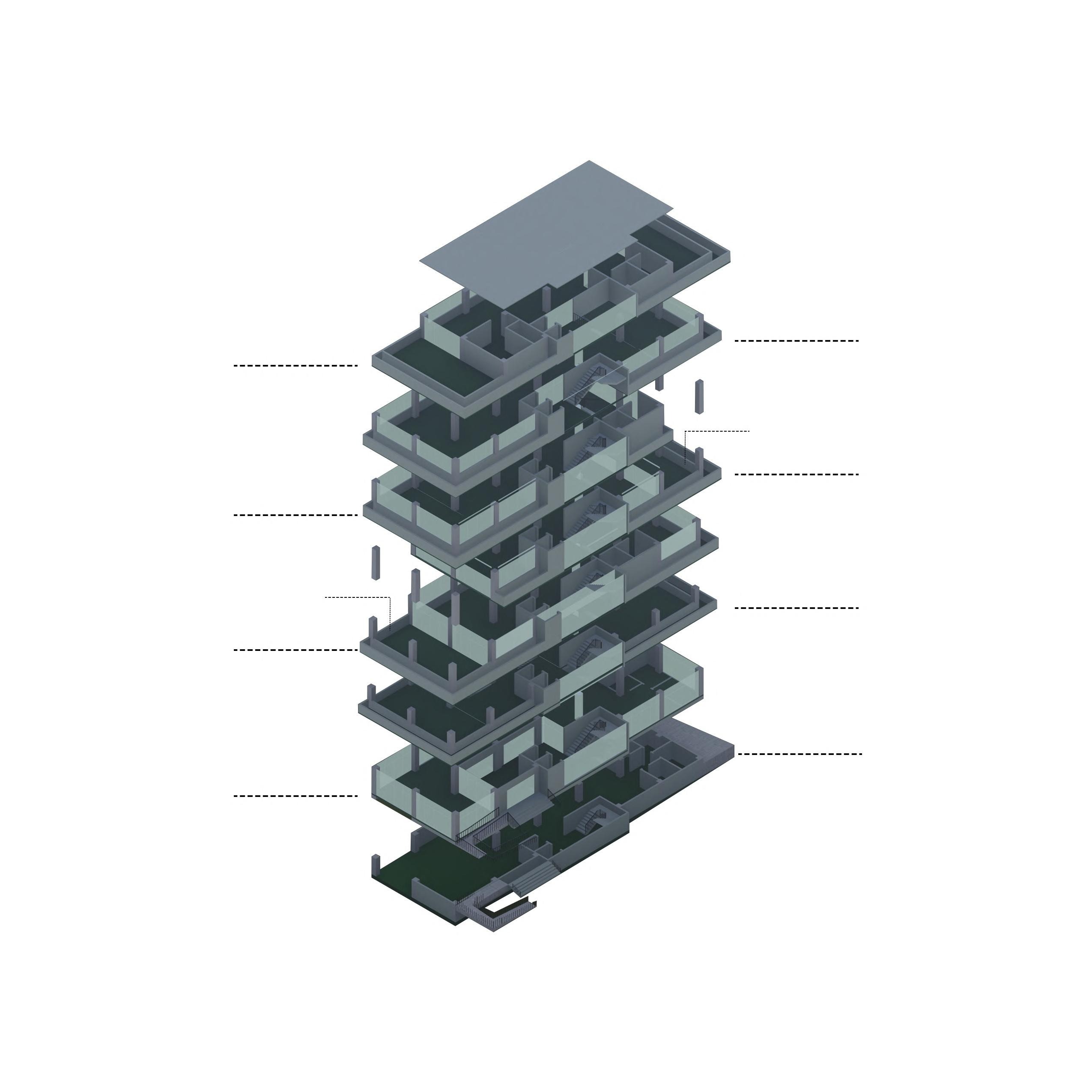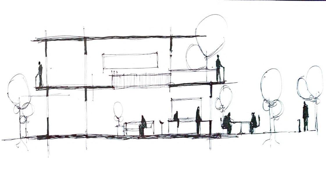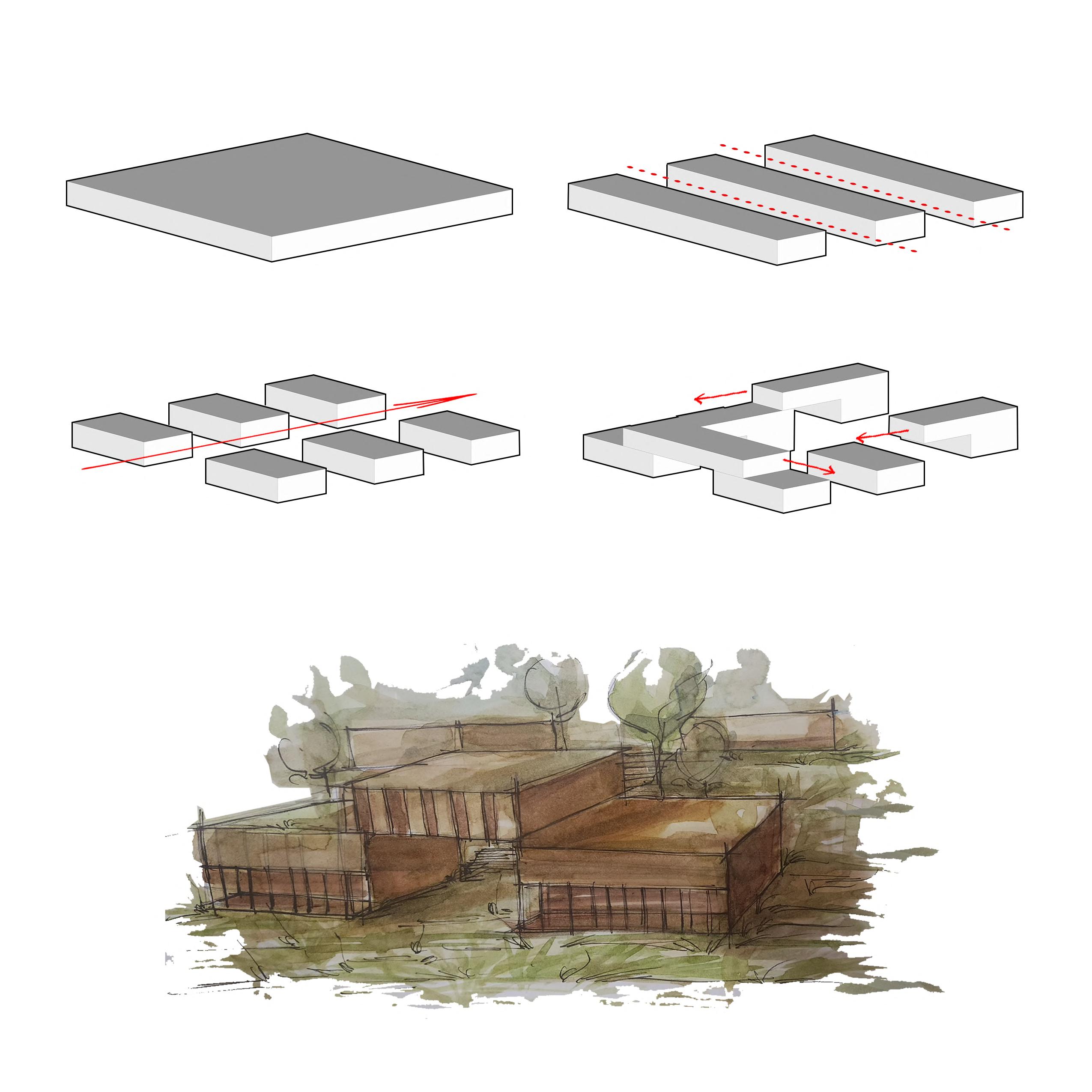 utilizing the contour site in creating stepped blocks which are visually connected to each other.