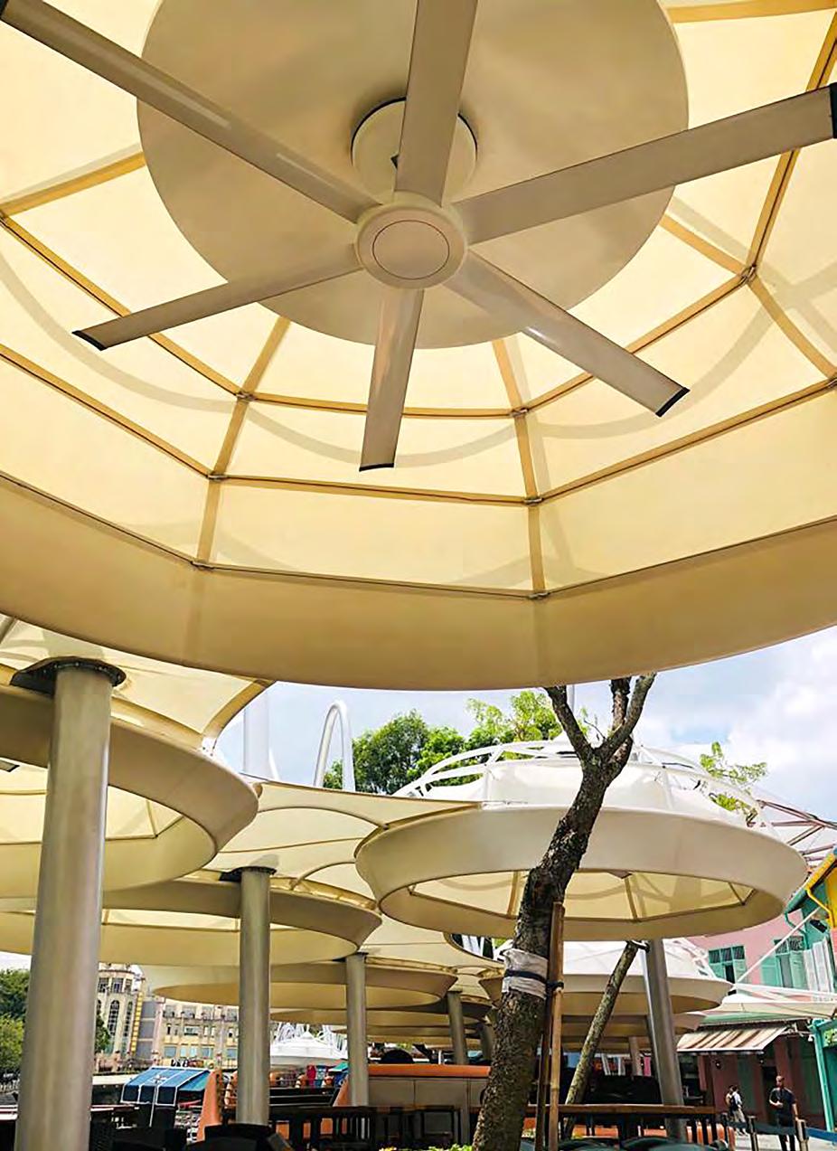 As the Design Village Penang consists of a series of buildings that form an open-air retail complex, this series of ETFE canopies create spaces that are sheltered from the rain but still allow plenty of sunlight. The use of double-layer cushion systems allows fewer intermediate supporting members as compared to a glass structure, and the tinted blue ETFE film and silver dot printing effectively cuts the heat transmission of the canopy.
