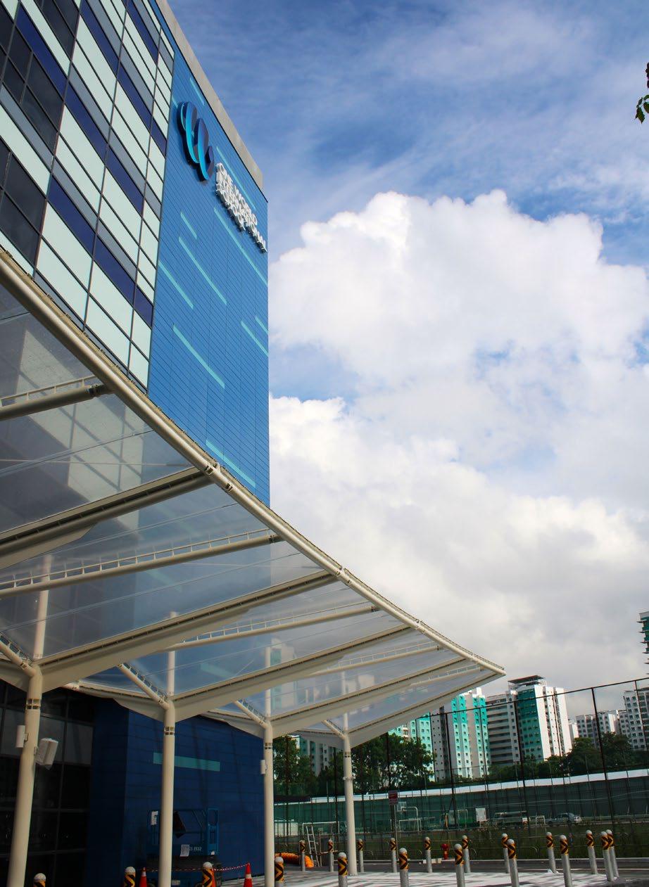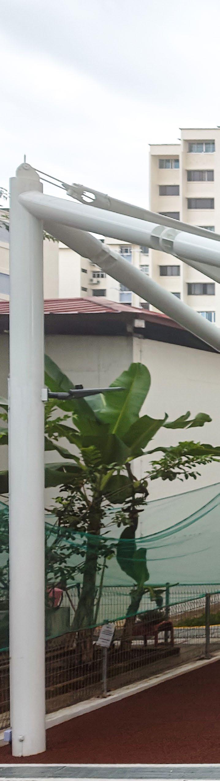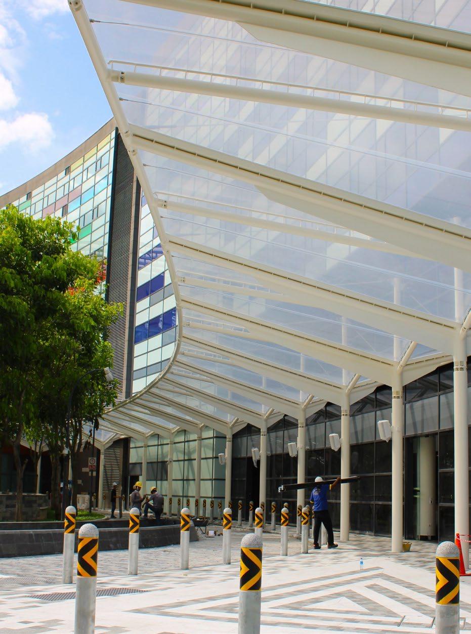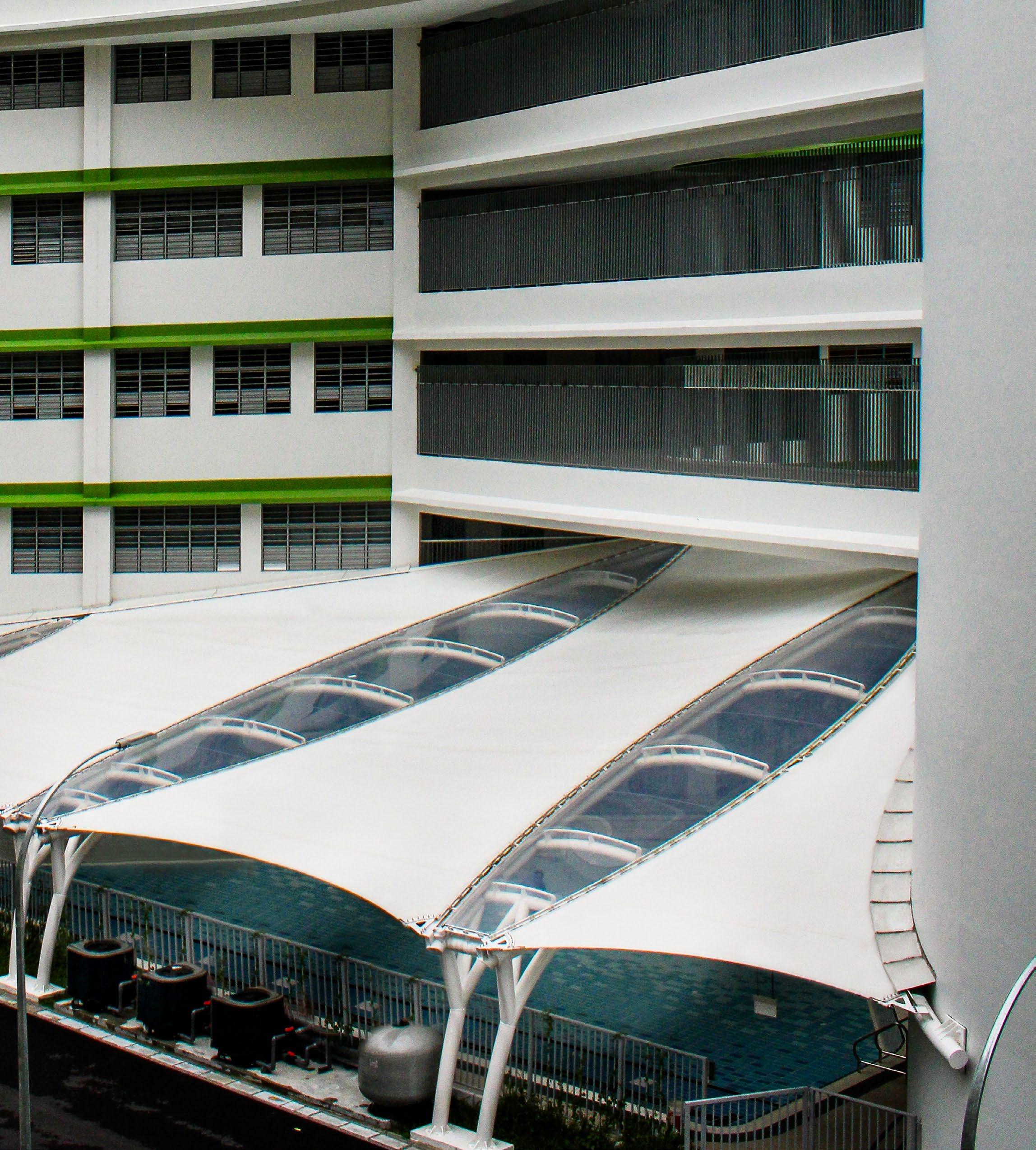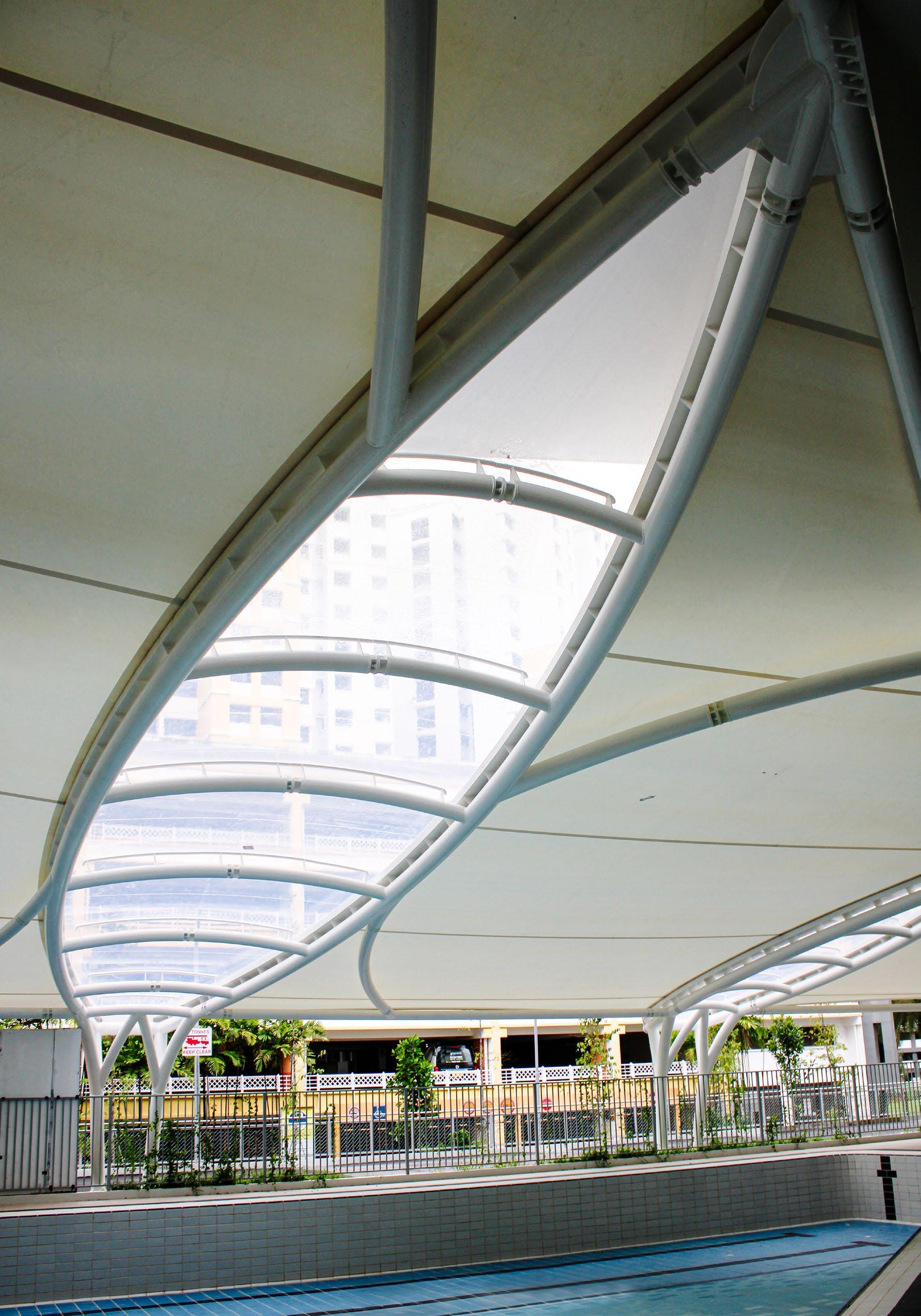 Located at an educational institution at Admiralty Lane, Singapore, our shelter provides shade from both the sun and rain to encourage students to utilise the hydrotherapy pool more frequently. The use of architectural steel improves the features’ visual appeal of the canopy, with transparent ETFE skylights integrated between the PTFE fabric to bring natural light into the interior space below.