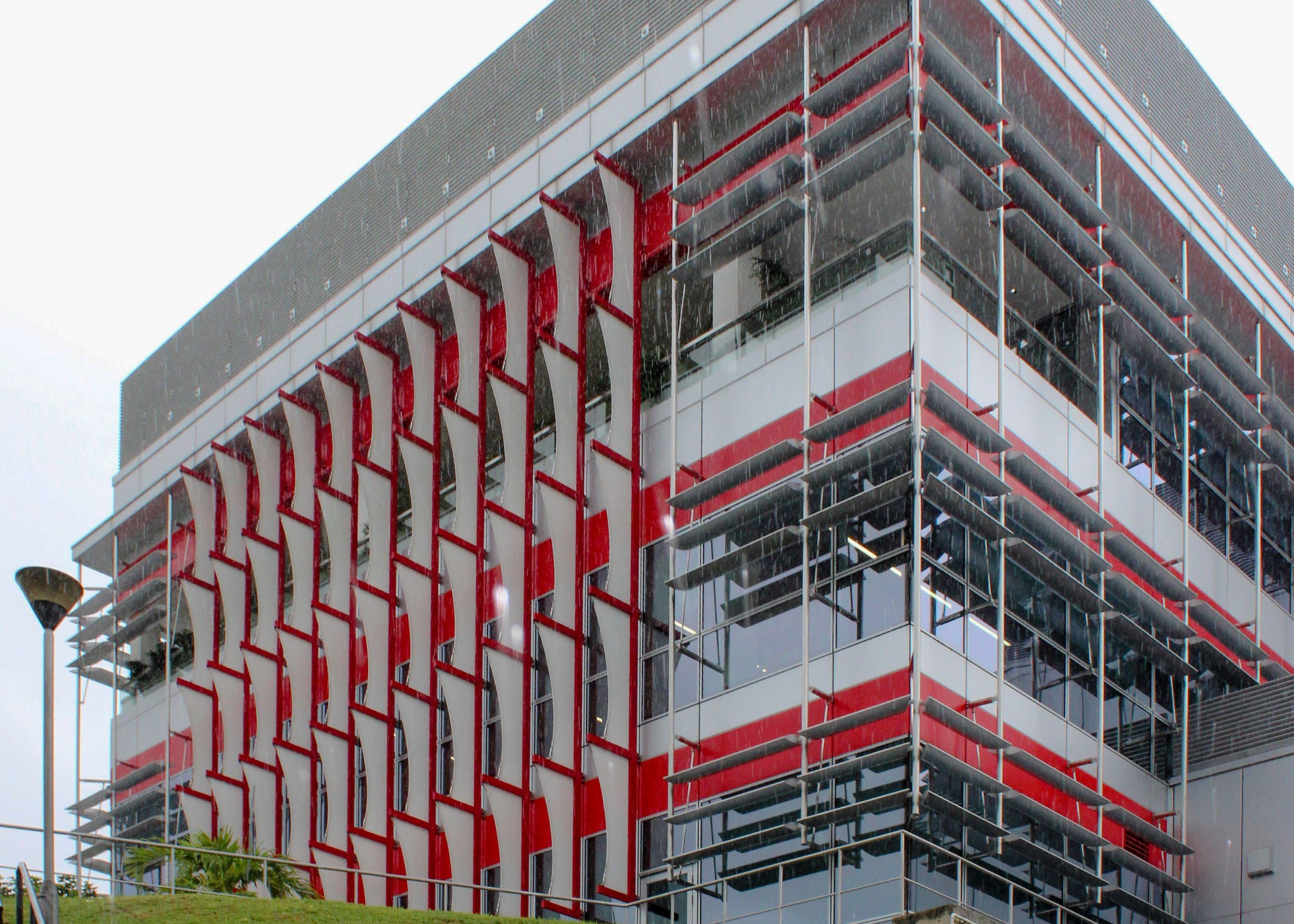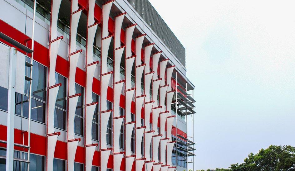 Located in the industrial district of Singapore, the vertical fin façade improves the thermal comfort of the internal spaces while also adding an aesthetically pleasing and practical architectural element to the exterior facade. The modularised lightweight fabric panels allow for a quick and efficient installation method.