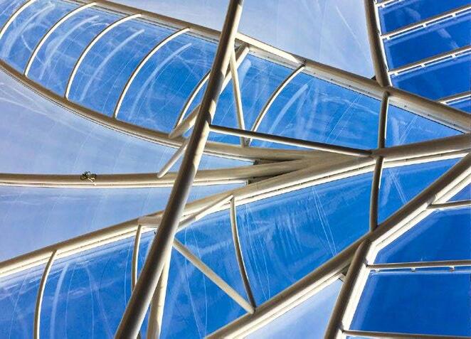 This transparent canopy consists of ETFE Single Layer and Double Layer Cushions held up by a dynamic structural support system. Due to the varying light transmission properties, this single-layer and cushion ETFE hybrid creates vibrant and dynamic shadow effects, utilising a sunny day to bolster aesthetics.