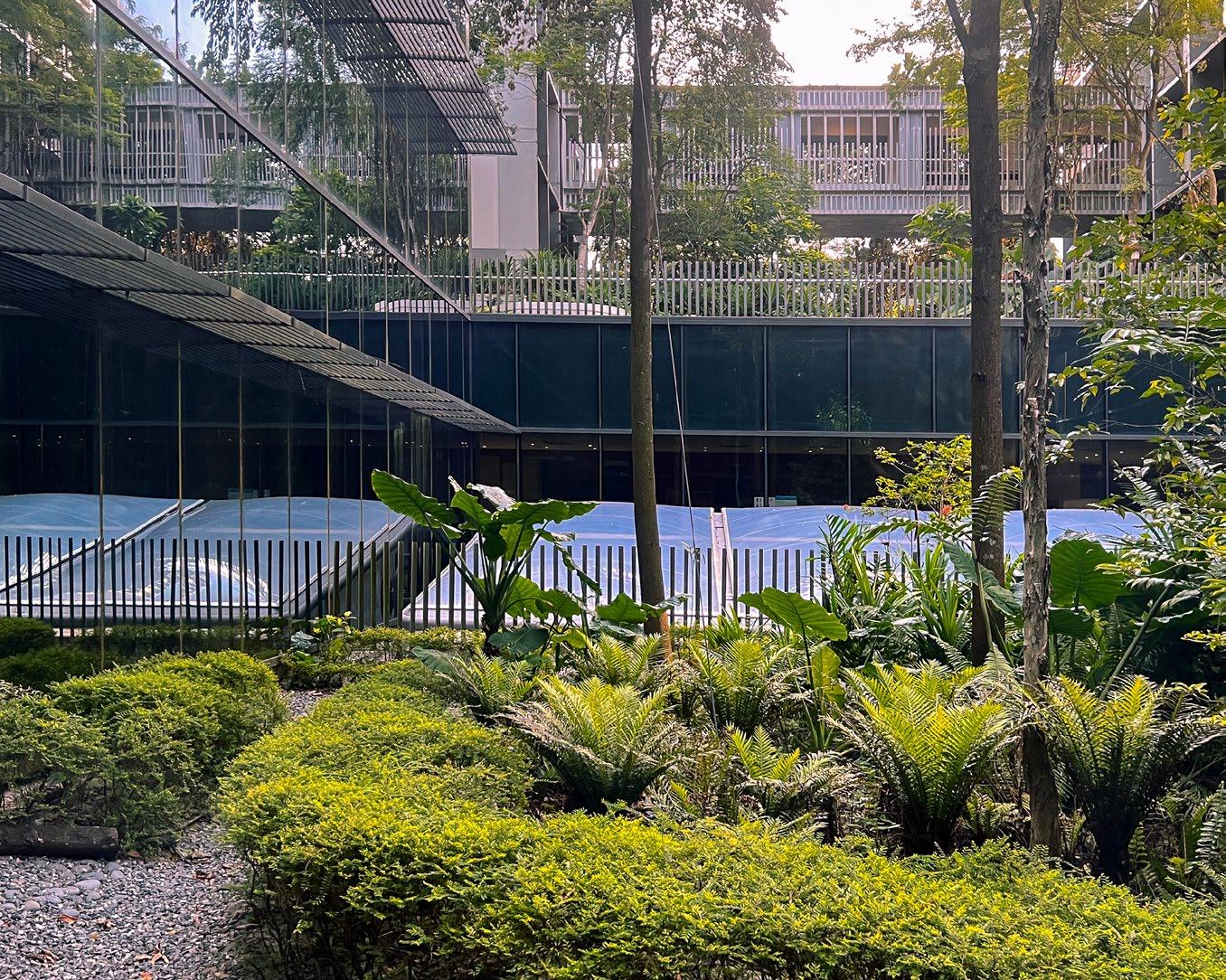 The Design Village itself is in a natural, single-storey, naturally - ventilated park that features cool, well - sheltered verandah walkways and connectors, nestled within a lush tropical garden setting. The architectural approach is one that is contemporary, stylistically international, and non-thematic. Yet references are made to Georgetown City’s historical urban scale, visual texture, and architectural tapestry in the physical composition of the Design Village — to give it a character emblematic of its locale.