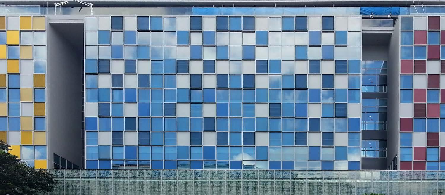 Fabric Facade is an alternative to metal facades, which lack the flexibility for freeform shapes. Lightweight and economical, the fabric properties maintain exterior visibility while providing glare and heat protection. It also creates opportunities to play with lighting and colours on the facade.