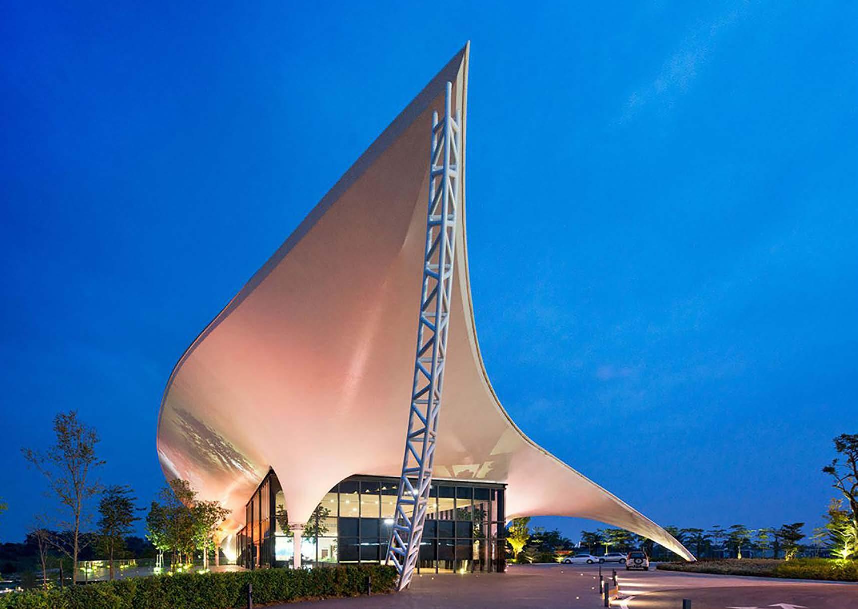 The Sunway Iskandar Events Gallery sits on the banks of Emerald Lake, serving as a node within a network of ecoparks, green pockets, water bodies, and green corridors. The distinct form of the roof canopy is envisioned as one elegant swoop, clad in TiO2-coated PVC fabric. The choice of material allows the building to emit a warm, soft glow in the evenings, and also reduces the need for heavy structural support, cleaning, and maintenance.