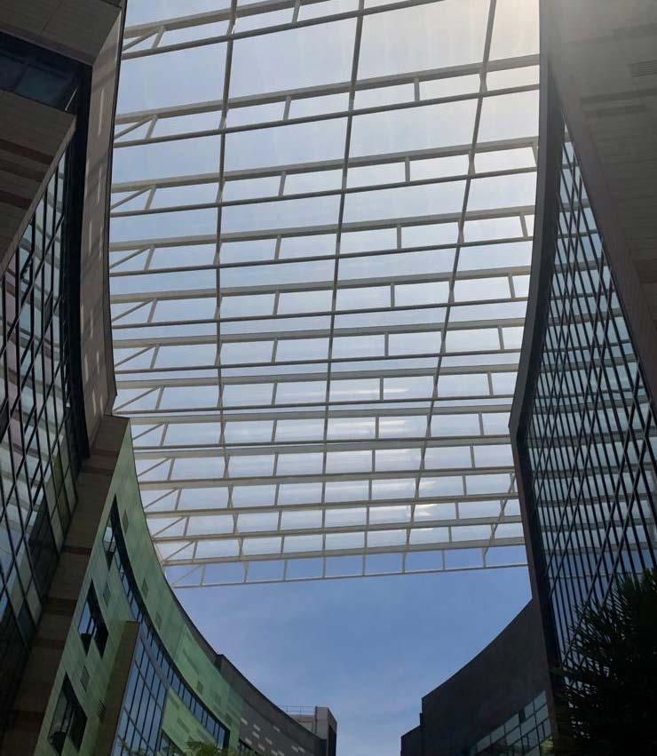 Located at Changi Business Park, the 800m2 canopy at Ascendas Plaza 8 has a sleek form that shades a spacious, naturally lit plaza below. The use of single-layer ETFE is able to create a form that is not limited by the rigid and bulky constraints of glass panels.