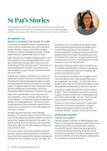 DR AMANDA LAU MAKING A DIFFERENCE, ONE PATIENT AT A TIME Dr Amanda Lau had her first taste of volunteering on a trip to Vietnam several years ago, which she found hugely rewarding. However, with COVID curtailing her plans to continue volunteering overseas, Amanda began looking for opportunities closer to home. “I was looking at the volunteering opportunities on the ADA website to find something suitable that I could get involved with, and soon after I came across an article about St Pat’s receiving a grant,” she recalls. “It was something that I thought I could work into my busy schedule, so I got in contact with them towards the end of 2020.” Amanda now volunteers at St Pat’s once a month. “It’s opened up my eyes to the world of homelessness and financial and social disadvantage and made me realise that, especially with the effects of COVID, a lot of these people are regular people who have had jobs and homes, but due to unfortunate circumstances, have found themselves unable to afford rent or the basics,” she says. At the clinic, Amanda does a lot of extractions, but also restorations, exams, dentures and the odd root canal treatment – and says the majority of patients are thankful and really appreciative. “A lot of them come in quite nervous but leave pleasantly surprised at how painless the procedure was, and are really happy to be out of pain,” she says. Amanda says there have been many satisfying moments. “The very first patient I saw at St Pat’s was a man who was extremely grateful and said I was the first person who had given him attention,” she recalls. “He was about to go for some interviews and said that by fixing up his teeth, he now had confidence to find a job and get back on track. “There was another woman who had been a victim of domestic violence and she had been in a few times to have a front tooth extracted that had been causing pain, but didn’t have the courage on the day,” she adds. “On