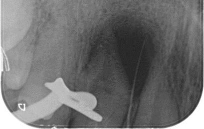 X-ray 1: A large periapical radiolucency in association with tooth #12, with a gutta-percha point tracing through the visible sinus tract originating from this area.