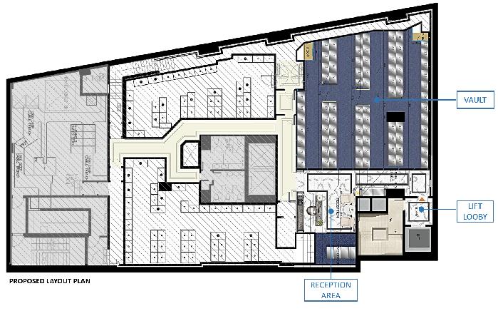 The project site is in the basement, chosen for its privacy and high-security potential. Safety is ensured through 'Privacy' and 'Security,' incorporating English design culture characterized by harmony and symmetry. The entrance and reception area feature brown molding with detailed frames and stainless steel fixtures, complemented by a marble floor, creating an atmosphere of distinction for honored guests.