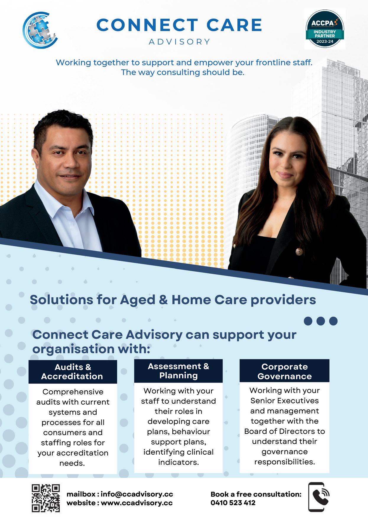 Aged Care Today is the regular publication of Aged & Community Care Providers Association (ACCPA). Unsolicited contributions are welcome but ACCPA reserves the right to edit, abridge, alter or reject material. Opinions expressed in Aged Care Today are not necessarily those of ACCPA and no responsibility is accepted