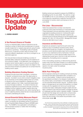 BCA: Poor Fitting Out Some engineers entering into building contracts are finding themselves financially embarrassed after completion of a fit out in their building. Problems can be traced back to the specification provided to the designer/ builder because the criteria mainly concentrated on the building fabric and not the potential internal tenancy layouts. A partition layout (plant or storage layout) can cause the building to no longer comply with the regulations for items such as exit travel, excessive fire loads, inadequate emergency lights and exit signs, insufficient hose reel and hydrant coverage as well as an inadequate sprinkler system originally installed. Engineers should insist that design and construction contracts (new buildings or alterations to existing) take into account the future use and include in the tender documentation of all internal plan details. n The Hendry Group pioneered the private certification of building approvals in Australia. Derek’s nationally based Group (includes Essential Property Services) provides building control and essential safety measures audits. The Group’s monthly e-newsletter can be viewed on www.emau.com.au and BCA Illustrated (BCA Online with 3000 illustrations) on www.bcai.com.au