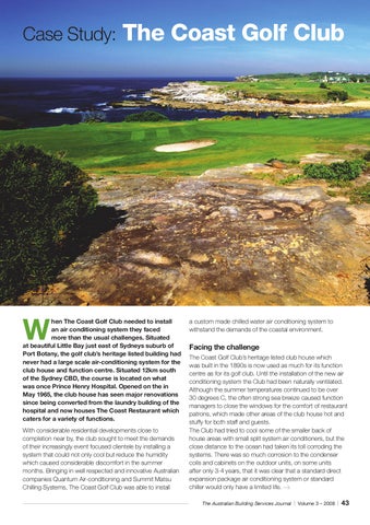 Facing the challenge The Coast Golf Club’s heritage listed club house which was built in the 1890s is now used as much for its function centre as for its golf club. Until the installation of the new air conditioning system the Club had been naturally ventilated. Although the summer temperatures continued to be over 30 degrees C, the often strong sea breeze caused function managers to close the windows for the comfort of restaurant patrons, which made other areas of the club house hot and stuffy for both staff and guests. The Club had tried to cool some of the smaller back of house areas with small split system air conditioners, but the close distance to the ocean had taken its toll corroding the systems. There was so much corrosion to the condenser coils and cabinets on the outdoor units, on some units after only 3-4 years, that it was clear that a standard direct expansion package air conditioning system or standard chiller would only have a limited life. > The Australian Building Services Journal | Volume 3 – 2008 |