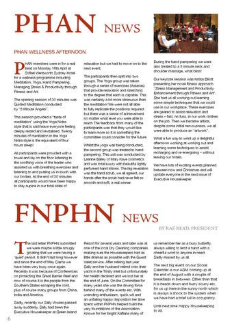 During the hand pampering we were also treated to a 5 minute neck and shoulder massage, what bliss! Our keynote session was Krista Elliott presenting her novel fitness approach “Stress Management and Productivity Enhancement through Fitness and Art”. She had us all working out learning some simple techniques that we could use in our workplace. These exercises are geared to assist relaxation and stress – fast, no fuss, in our work clothes on the job. Then we became artists, despite some initial nervousness, we all were able to produce an “artwork”. What a fun way to wind up a delightful afternoon working at working out and learning some techniques to assist recharging and re-energising – without leaving our hotels. We have lots of exciting events planned between now and Christmas and will update everyone in the next issue of Executive Housekeeper.