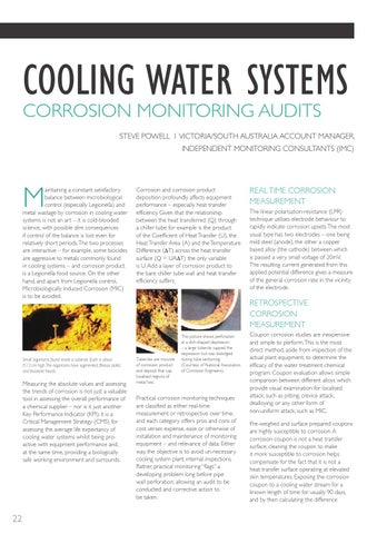 Practical corrosion monitoring techniques are classified as either real-time measurement or retrospective over time, and each category offers pros and cons of cost verses expense, ease or otherwise of installation and maintenance of monitoring equipment – and relevance of data. Either way, the objective is to avoid un-necessary cooling system plant internal inspections. Rather, practical monitoring “flags” a developing problem long before pipe wall perforation, allowing an audit to be conducted and corrective action to be taken.