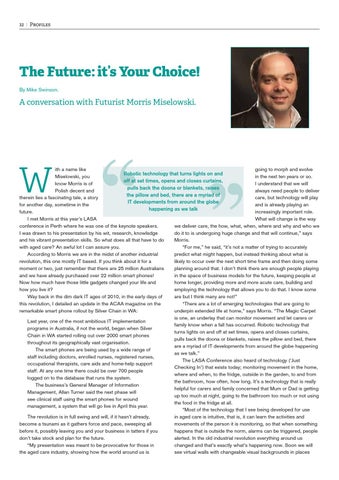 ith a name like going to morph and evolve Robotic technology that turns lights on and Miselowski, you in the next ten years or so. off at set times, opens and closes curtains, know Morris is of I understand that we will pulls back the doona or blankets, raises Polish decent and always need people to deliver the pillow and bed, there are a myriad of therein lies a fascinating tale, a story care, but technology will play IT developments from around the globe for another day, sometime in the and is already playing an happening as we talk future. increasingly important role. I met Morris at this year’s LASA What will change is the way conference in Perth where he was one of the keynote speakers. we deliver care, the how, what, when, where and why and who we I was drawn to his presentation by his wit, research, knowledge do it to is undergoing huge change and that will continue,” says and his vibrant presentation skills. So what does all that have to do Morris. with aged care? An awful lot I can assure you. “For me,” he said, “it’s not a matter of trying to accurately According to Morris we are in the midst of another industrial predict what might happen, but instead thinking about what is revolution, this one mostly IT based. If you think about it for a likely to occur over the next short time frame and then doing some moment or two, just remember that there are 25 million Australians planning around that. I don’t think there are enough people playing and we have already purchased over 22 million smart phones! in the space of business models for the future, keeping people at Now how much have those little gadgets changed your life and home longer, providing more and more acute care, building and how you live it? employing the technology that allows you to do that. I know some Way back in the dim dark IT ages of 2010, in the early days of are but I think many are not!” this revolution, I detailed an update in the ACAA magazine on the “There are a lot of emerging technologies that are going to remarkable smart phone rollout by Silver Chain in WA: underpin extended life at home,” says Morris. “The Magic Carpet is one, an underlay that can monitor movement and let carers or Last year, one of the most ambitious IT implementation family know when a fall has occurred. Robotic technology that programs in Australia, if not the world, began when Silver turns lights on and off at set times, opens and closes curtains, Chain in WA started rolling out over 2000 smart phones pulls back the doona or blankets, raises the pillow and bed, there throughout its geographically vast organisation. are a myriad of IT developments from around the globe happening The smart phones are being used by a wide range of as we talk.” staff including doctors, enrolled nurses, registered nurses, The LASA Conference also heard of technology (‘Just occupational therapists, care aids and home-help support Checking In’) that exists today; monitoring movement in the home, staff. At any one time there could be over 700 people where and when, to the fridge, outside in the garden, to and from logged on to the database that runs the system. the bathroom, how often, how long. It’s a technology that is really The business’s General Manager of Information helpful for carers and family concerned that Mum or Dad is getting Management, Allan Turner said the next phase will up too much at night, going to the bathroom too much or not using see clinical staff using the smart phones for wound the food in the fridge at all. management, a system that will go live in April this year. “Most of the technology that I see being developed for use The revolution is in full swing and will, if it hasn’t already, in aged care is intuitive, that is, it can learn the activities and become a tsunami as it gathers force and pace, sweeping all movements of the person it is monitoring, so that when something before it, possibly leaving you and your business in tatters if you happens that is outside the norm, alarms can be triggered, people don’t take stock and plan for the future. alerted. In the old industrial revolution everything around us “My presentation was meant to be provocative for those in changed and that’s exactly what’s happening now. Soon we will the aged care industry, showing how the world around us is see virtual walls with changeable visual backgrounds in places