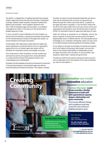 As we reflect on the past two decades of inquiries and reports, all of which failed to bring about real change, we know that reform is the shared responsibility of stakeholders across the aged care sector from providers, to care providers, care recipients, allied health, medical and government. The team at LASA look forward to sharing the reform journey with our Members and in the interests of the older Australians you care for and support. ■